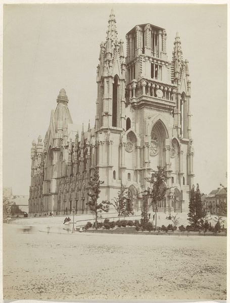 Editor: This is "Gezicht op de Stephansdom in Wenen, Oostenrijk" a photograph, a gelatin silver print, created sometime between 1851 and 1900 by M. Frankenstein & Co. It's such a stark and imposing image, like a dream made of stone. The church is obviously the focal point but what I find most compelling is the presence of human activity juxtaposed with this monumental structure. What strikes you about this photograph? Curator: The sheer audacity of its verticality! The way the spire claws at the sky... But what truly fascinates me is how Frankenstein & Co. captured a living, breathing cityscape. Not a sterile, perfect monument, but something messy, vibrant. See the scaffolding clinging to the cathedral like a determined vine? It whispers of constant reinvention, a beautiful defiance against static perfection. This work makes me wonder, are we merely documenting or are we conjuring? Editor: I hadn't considered the scaffolding that way – a defiant vine! That totally shifts my perspective. Curator: It's like life asserting itself onto this grand, supposedly timeless edifice. Do you see the figures down below? Specks, almost, yet their presence anchors the scene in human experience, doesn’t it? Without them, it would be just another postcard. I find it oddly comforting to see a coffee shop situated just off of the churchyard. It reminds me that there is room for the secular right outside hallowed halls. What an inclusive feeling. Editor: It does feel a lot more approachable all of a sudden. I was initially intimidated by its grandeur, but now it feels… more welcoming somehow? More human? Curator: Precisely! This photograph is more than just architectural documentation; it’s a fleeting portrait of Vienna in perpetual dialogue with itself. What a fascinating dance between ambition and entropy. This picture makes me feel at peace somehow. Editor: I totally agree. I guess that is why the artist had to immortalize that place and time, by any medium available.