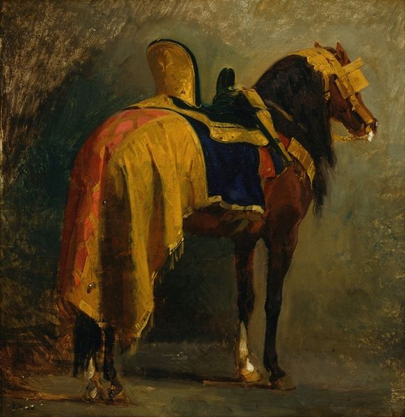 Editor: We're looking at Velázquez's "A White Horse" from 1635, an oil on canvas currently residing in Madrid's Palacio Real. I'm struck by how the darkness seems to press in on the horse, making its whiteness so prominent. What do you see when you examine the formal qualities of this work? Curator: The immediate draw is, as you say, the stark contrast. Consider how Velázquez utilizes the tenebrism, a pronounced chiaroscuro. Notice how the light doesn't merely illuminate, it sculpts. It defines the musculature of the horse, drawing our eye along specific lines and planes. What sort of spatial relationships do you observe between the horse and its environment? Editor: Well, it almost feels like the background is undefined, creating a sense of shallow space. The horse is undoubtedly the subject, highlighted by the light, but there’s not a lot of information about where the animal exists within the frame. It is set in a vague interior with the use of primarily neutral earth tones, making the subject "pop" even further. Curator: Precisely. This lack of spatial clarity focuses attention on the interplay of form and color. Observe the limited palette: mostly shades of white, grey, and brown. How does this impact the composition? Consider how the horse's dynamism, caught mid-prance, contrasts with the relative stillness of the implied setting. It strikes the eye to feel off balanced. Editor: It seems intentional, though. The contrast between light and shadow, motion and implied stillness… it's like a study in contrasts. I never would have picked up on this! Curator: It is these considered relations that bring out meaning in visual experience. Understanding these techniques and being conscious of the art will bring more meaning in what we visually perceive.