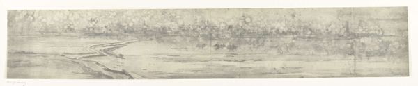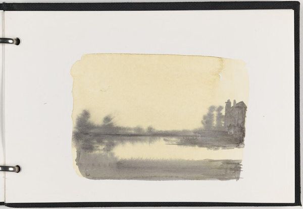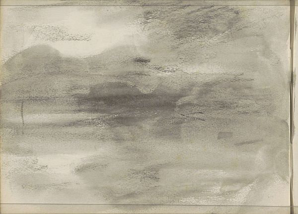 Editor: Here we have Frères Moreau's "Gezicht op Sint-Andries, 1672," a watercolor done around 1900-1903. The colors are so muted, almost like looking at a faded memory. I’m struck by how abstract it feels, even though it’s classified as a landscape. What do you see in this piece? Curator: I see a conscious negotiation with the possibilities of the watercolor medium. It isn't about just depicting the town, but experimenting with pigment and water on paper. Notice how the "sky" is almost pointillist in application? The process seems as important as, if not more than, the representation. Editor: So, you’re saying the materials themselves become part of the story? How so? Curator: Absolutely. The thin washes and granular textures challenge our typical notions of 'high art.' Consider the accessibility of watercolor, a relatively inexpensive and easily portable medium. Was this meant for mass production or for an elite patron? Also, the texture—almost rough—subverts that smoothness that a patron might desire. This piece seems like an exercise, or a conscious effort to democratize landscape art through material choice. Editor: That’s fascinating. I never thought about the socioeconomic implications of choosing watercolor versus, say, oil paint. So by focusing on the material, we shift our focus from subject matter to the very act of creation? Curator: Precisely! The choice of materials and application become an integral part of the artwork's meaning. It invites questions about who made it, for whom, and why this medium. How labor comes into play affects the cultural context of landscape and art creation. Editor: I guess I was so focused on the faint image that I missed the materiality of it all. Curator: That’s understandable. Seeing the piece through a materialist lens helps unpack those subtle, yet important choices. Editor: This really gave me something to think about: how art can make visible its mode of production through materiality.