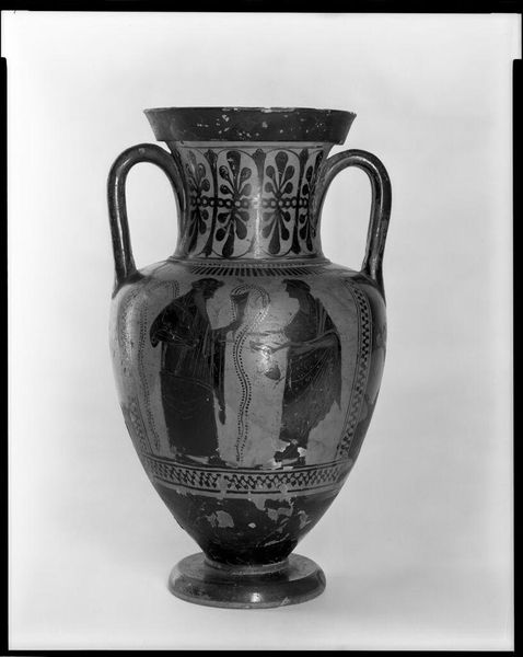 Editor: This is a lekythos, or oil flask, depicting a woman and maid, by The Achilles Painter. I’m struck by how the figures seem to float ethereally on the vase. What can you tell me about the significance of these figures and their arrangement? Curator: The image of the woman and maid is a poignant representation of domesticity and ritual. Consider the cultural memory embedded in this scene; women, often associated with the private sphere, are elevated. The vase itself, a container for oil, further symbolizes nurturing and care, doesn’t it? Editor: I never thought of it that way. Curator: Think about the symbols, their repeated usage, their cultural weight. It changes our understanding of the art, right? Editor: Definitely! This gives me a lot to think about.