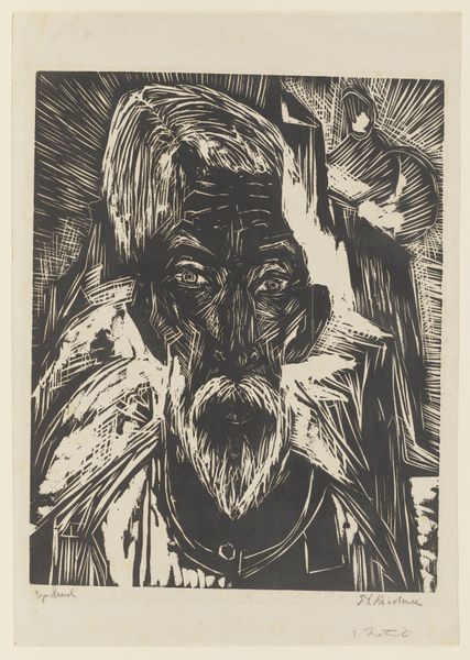 Editor: We’re looking at Lodewijk Schelfhout's "Head of Christ with Halo," a woodcut print from 1924 housed here at the Rijksmuseum. The monochrome and linear rendering really strikes me. It's so austere, almost unsettling. How do you interpret this work through the lens of its visual elements? Curator: Indeed. Consider the stark contrast—the sharp black lines carving out form from the pale void. The compressed planes of the face are striking. Notice how the aureole isn’t softly luminous but aggressively radiating, constructed of hard, unmodulated lines. Does this aesthetic choice resonate with any formal qualities typical of Expressionist printmaking? Editor: I see what you mean! The geometric planes composing his face feel almost… Cubist? And the harsh, raw lines defining the halo are definitely Expressionistic. It almost looks like broken glass radiating from his head. Curator: Precisely. Note the almost brutal simplification of the facial features. The eyes, mere slits; the mouth, a compressed line. These aren’t details meant to humanize, but rather to deconstruct. Could we interpret this abstraction not as reverence, but as an exploration of form, an exercise in reducing an iconic image to its graphic essence? The texture, achieved through the woodcut medium, emphasizes this stark quality. Editor: So, instead of the usual sympathetic or divine portrayal of Christ, Schelfhout prioritizes line, form and material, making us confront the very construction of the image itself. I’d never considered approaching a religious subject so analytically! Curator: It invites us to contemplate the intersection of the spiritual and the formal—challenging the assumed narrative through the materiality of the work. It encourages a reconsideration of how meaning is produced.