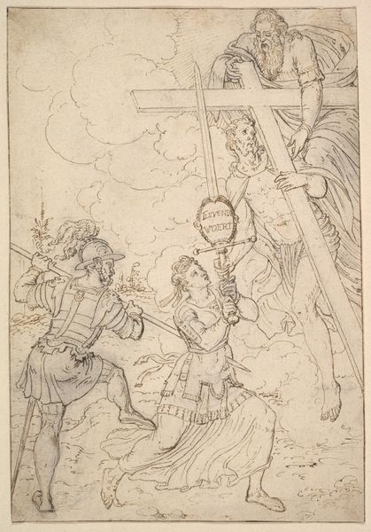Editor: Here we have an ink drawing on paper, titled "Study for a Picture," dating back to the 17th century. The figures seem frozen mid-action, almost like a snapshot from a play. The artist created such a detailed image using primarily lines. What do you see when you look at the piece? Curator: It strikes me as an exploration of line and form, independent of any specific narrative function. Note the artist's deployment of line. How do the variations in weight and density contribute to the overall composition? Consider, for instance, how certain areas are rendered with short, rapid strokes, while others are defined by longer, more deliberate lines. Editor: Yes, now that you mention it, the varying line weights create a sort of visual hierarchy. But it's interesting how much is suggested with so little tonal variation. Curator: Precisely. The interplay between positive and negative space, shaped only through lines, generates an intriguing dynamism. Consider the figures: they are present merely through their contours, their essence conveyed not through volume, but the suggestion of volume by expertly applied strokes. Does that not tell us something about how to derive the meaning through form and figure in this study? Editor: Absolutely. I was initially drawn to the suggested drama, but now I am more interested in appreciating the elegant simplicity in its lines, which makes it easier to view these strokes independently and reflect on their shape and placement in the frame. Curator: An excellent observation. The genius lies in this controlled yet expressive manipulation of line and space. It exemplifies how seemingly basic elements can yield profound aesthetic interest, offering insights into pictorial structure that transcend subject matter.
