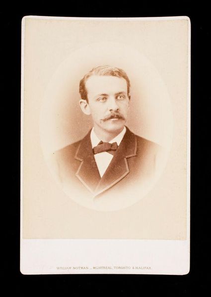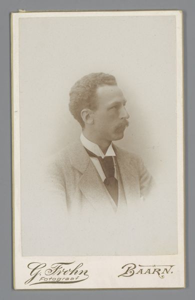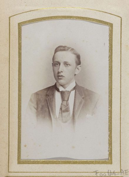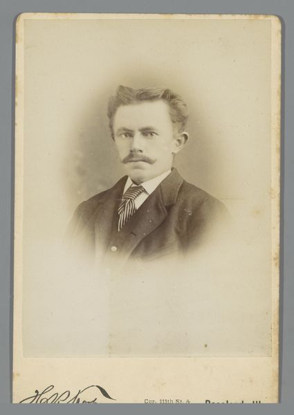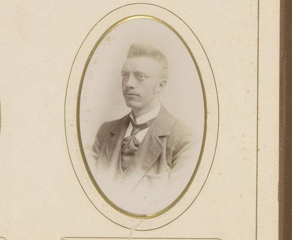 Curator: It always amazes me to look back at daguerreotypes, snapshots from so long ago. Here we have one of an unknown man by Boute-Dooreman, dating from 1894. Editor: Sepia dreams, that’s my first thought. It’s like stepping into a silent film, the kind where you know something terribly romantic or melancholy is about to happen. Curator: Ah, but beyond the feeling, look at the composition. Notice how the artist uses light to draw your eye directly to his face. The sharpness of his features, set against the softer, slightly blurred background creates depth and presence. Editor: The clothes, too, speak volumes, don't they? The dark suit, that impeccably tied tie... it all screams middle class respectability. You can almost smell the faint whiff of mothballs and pipe tobacco just by looking at it. Curator: Photography in that era wasn't just about documentation; it was about constructing an image, both literally and figuratively. Consider the slight upturn of the man's lip, or the deliberate grooming of the hair. Are these conscious attempts to project confidence? What about his stare? He seems rather intense, yet subdued. Editor: I bet he practiced that look in the mirror. But seriously, there's something deeply vulnerable here as well, perhaps stemming from knowing he's participating in this somewhat surreal, new technology. It’s more than just capturing an image, isn’t it? It’s freezing a moment, confronting mortality. He won't look this age forever; nobody does. Curator: Exactly! That awareness of time and impermanence enriches our viewing. Boute-Dooreman really understood how to wring maximum impact from minimal tools. Editor: Agreed. A powerful meditation, really, on time, memory, and the quiet dignity of ordinary lives. This man lived, loved, maybe failed and succeeded in ways we'll never know, but in that image he briefly returns to life.