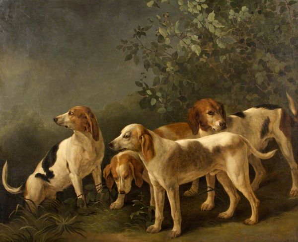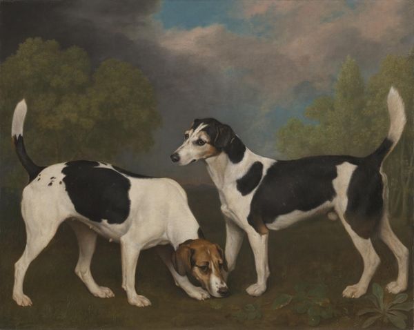Editor: So here we have George Stubbs' oil painting, "Foxhound on the Scent," from around 1760. What strikes me most is how dignified the dog looks, almost like a canine portrait set against a surprisingly melancholic landscape. What’s your take on it? Curator: I see a powerful commentary on the changing role of animals within 18th-century British society and the emerging cultural value of the "noble" countryside. Hunting was undergoing a transformation, becoming less about sustenance and more about sport for the landed gentry. Doesn't the dog itself almost seem to be an aristocratic figure, carefully bred and positioned within this landscape? Editor: That's a really interesting point! I hadn't considered the societal shift reflected in the dog's elevated portrayal. Is Stubbs making a statement, do you think, or simply documenting the prevailing attitude? Curator: Stubbs, an astute observer, was deeply embedded in that world. While he certainly possessed a keen eye for naturalistic detail – look at the anatomical precision! – he's also participating in constructing a visual language that legitimizes the power structures of the time. Consider the art market: Who commissioned and purchased such works? How did these images circulate and reinforce certain social hierarchies? Editor: So, the painting is not just a picture of a dog, but also a reflection of who could afford to have their world represented in art and the cultural values they were promoting? Curator: Exactly! The dog’s portrait, along with its romantic backdrop, reinforces the idea of a natural order and celebrates a specific kind of elite life connected to the land. How the institution of art – and artists like Stubbs – played a part. Editor: Wow, I will never look at another animal portrait the same way. It's fascinating to consider the artwork as not just beautiful, but as an active participant in its society! Curator: Indeed. Seeing art as intertwined with its socio-political fabric unlocks richer and more critical ways of engaging with it.