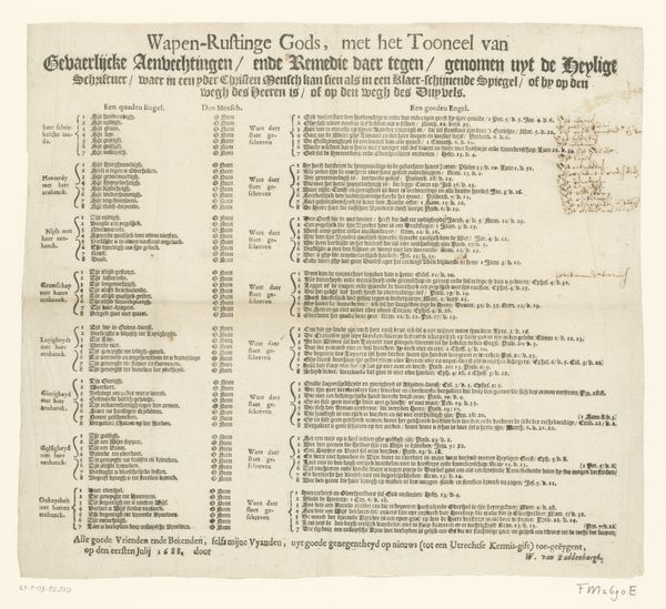 Curator: Here we have "Tekstblad bij de prent van het vertrek van Willem III naar Engeland en aankomst aldaar, 1688," or, "Text Sheet with the Print of William III's Departure to England and Arrival There," made in 1689 by Jacobus Robijn. It’s a fascinating example of early printed news. What’s your first reaction? Editor: Overwhelming! It feels like confronting a wall of meticulously ordered text. The density alone speaks to the era's hunger for information, presented with an almost bureaucratic intensity. It’s fascinating, in an information-overload kind of way. Curator: It's printed on paper, showcasing the typography skills of the Dutch Golden Age. The layout reminds me of a meticulously designed newspaper. It aimed to inform the public about a pivotal moment: William III's voyage to England. But what does it *mean*, do you think? Editor: Symbols aren't overt here; instead, the text itself becomes symbolic. The ordered columns, the exhaustive lists... it reflects a culture obsessed with control and record-keeping, even in times of monumental change. The very act of naming every captain and ship transforms a chaotic historical event into something manageable, comprehensible. Almost…official. Curator: Exactly! This text meticulously details the captains, ships, crew, and artillery involved. Imagine the public's desire for every last detail! There's a weight of cultural memory imbued in these words; almost a communal holding of breath. Editor: Yes, you're right, it's like a proto-news feed etched onto paper. It has this odd dual function: documenting history while simultaneously attempting to shape its narrative through the sheer weight of supposed fact. It’s not about storytelling so much as information aggregation as validation. And those long, unbroken paragraphs – a challenge to today’s fragmented attention spans. It speaks volumes about the patience, and perhaps the priorities, of the era. Curator: I find the almost clinical presentation quite powerful; the emotional impact comes from sheer data! A contrast to the flowery, romanticised narratives of later historical accounts. There's almost something defiant about the plainness. Editor: I agree! It's easy to overlook such textual artifacts amid grand paintings, but this piece reminds us that history often unfolded in the details. And now, I think I actually *do* know all the names of every single sailor on that crossing... Not really, but I now I understand how people did. Curator: It highlights a period that prized literacy and documentation – not just the 'great' events but every nitty-gritty detail. A nice change, and beautifully captured on paper.
