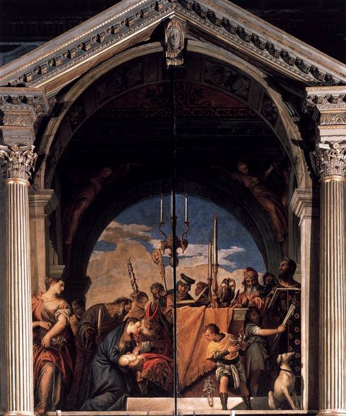 Palma il Giovane created this painting of the Nativity of Mary, sometime before his death in 1628, using oil on canvas. The painting overflows with figures arranged in a complex, multi-tiered composition. The colour palette, typical of Venetian painting, uses rich, deep blues, reds, and browns, creating a sense of warmth and drama. The structure of the painting is divided into earthly and heavenly realms. On earth, midwives attend to the newborn Mary, their gestures and gazes forming dynamic lines that draw the viewer's eye around the scene. Above, angels hover, bathed in a divine light, their presence suggesting a sacred event. The painting challenges fixed meanings by embedding this important religious event in an earthly domestic scene, while simultaneously lifting the subject through the placement of angels above. Il Giovane's mastery is evident in his arrangement of figures and use of colour, and the way he balances earthly and heavenly elements. The painting shows a moment suspended between human activity and divine presence. It is an invitation to explore how the sacred permeates everyday life.