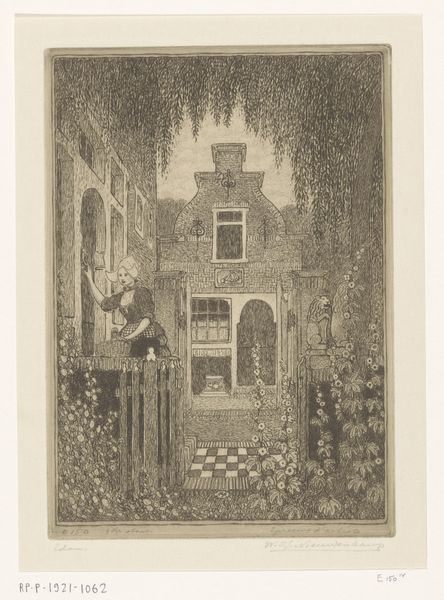 Wijnand Otto Jan Nieuwenkamp created this etching, "Vrouw in klederdracht die op een voordeur klopt in Edam," using delicate lines to depict a scene with a woman in traditional attire. The composition is structured around a central view of a house, framed by foliage, which creates a sense of enclosure and intimacy. The checkered pattern of the entranceway draws the eye inward, while the figure of the woman, positioned to the side, adds a dynamic element. Nieuwenkamp's choice of etching allows for fine detail, particularly noticeable in the rendering of textures and patterns. This attention to detail invites us to consider the social and cultural dimensions of the scene. The image seems to question fixed meanings about domesticity and social interaction. It destabilizes clear categories, engaging with broader questions about representation and cultural identity. The artist's meticulous technique and formal choices construct a rich visual experience. This is as much about the artist's way of seeing, as about any fixed interpretation of Dutch society and artistic representation.