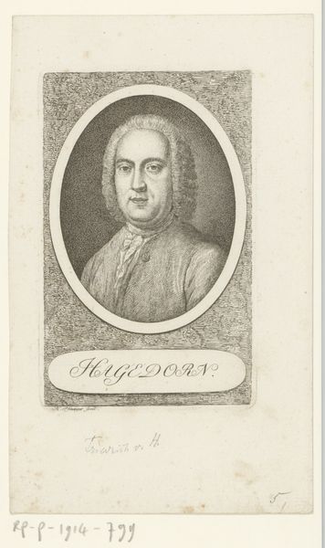 This is Heinrich Pfenninger's "Portret van Johann Jakob Scheuchzer," a small print measuring 129 by 88 millimetres. The portrait is encased within an oval frame, set against a structured background of horizontal lines that creates a subtle yet assertive visual plane. Pfenninger masterfully uses line and texture to define the sitter's features and clothing, employing delicate hatching and stippling to model the face and wig. The lines are tight and controlled, demonstrating a refined technique suited to the depiction of scholarly precision. Semiotically, the portrait is a study in contrasts: the rigid lines of the background versus the soft, flowing contours of the wig and robe. This juxtaposition hints at the tension between the structured world of scientific thought, embodied by Scheuchzer, and the more fluid, personal characteristics of the individual. Ultimately, the print functions not just as a record of appearance but as an exploration of form, line and texture.