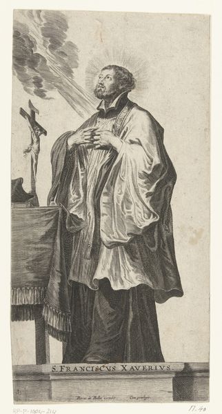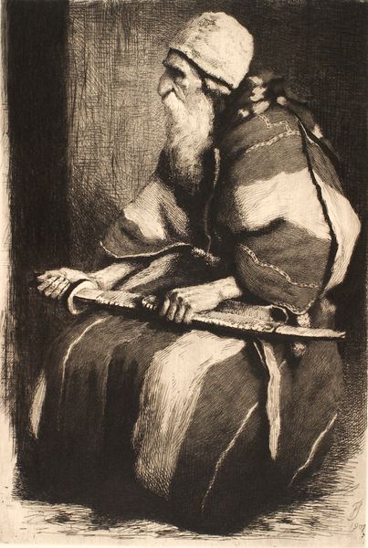 Editor: So here we have a charcoal drawing, "Aristoteles schrijvend achter een bureau," or Aristotle Writing at a Desk, created by Bernard Vaillant around 1672. It’s quite a stark portrait, very somber… What strikes you about this drawing? Curator: The raw vulnerability. It's less about the pomp of Aristotle's status and more about the quiet solitude of thought. That ragged robe… it’s a stark contrast to the opulent fabrics you’d usually associate with a philosopher of his standing, isn’t it? More hermit than head honcho. The light feels almost like it’s betraying his struggle. What do *you* see there, between those flickering lines? Editor: I see… almost a performance? He's posed, isn't he? With the scroll in one hand and actively writing. Is he *really* in deep thought or projecting it? Curator: Ah, the eternal question of authenticity! Is he the real deal, or just playing the part? Maybe it's both? The beauty of a piece like this is that it invites you to wrestle with that. Those little clues the artist gives us – the almost theatrical lighting, the furrowed brow… it all hints at a carefully constructed image, even if the “real” Aristotle was just having a bad hair day. Editor: I suppose you're right. It's about the image of wisdom, even if the reality is more… mundane. This really changed the way I looked at the artwork. Thanks for the chat! Curator: Absolutely. And who knows? Perhaps that "mundane" is where the truest wisdom lies! Food for thought, eh?