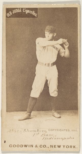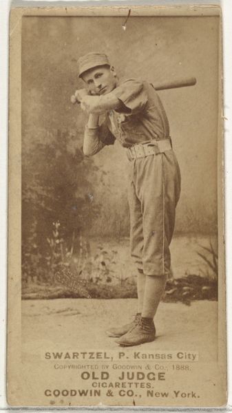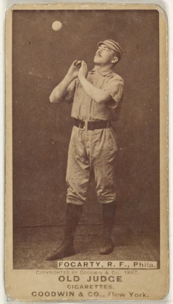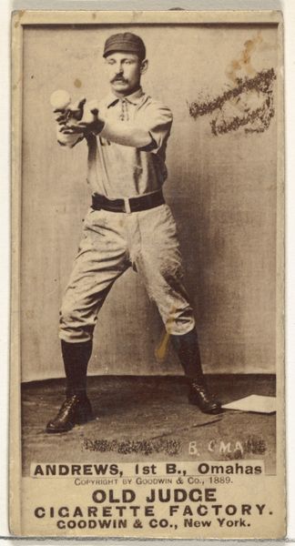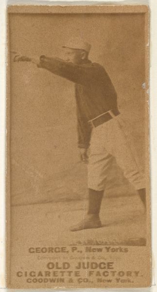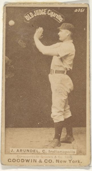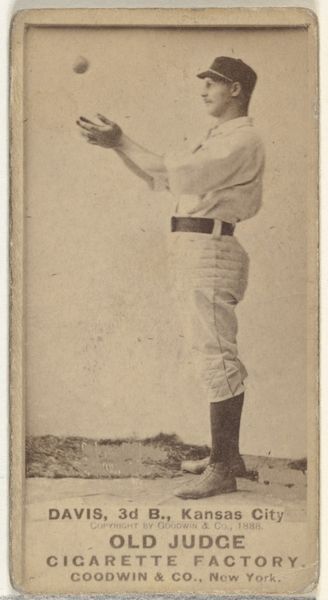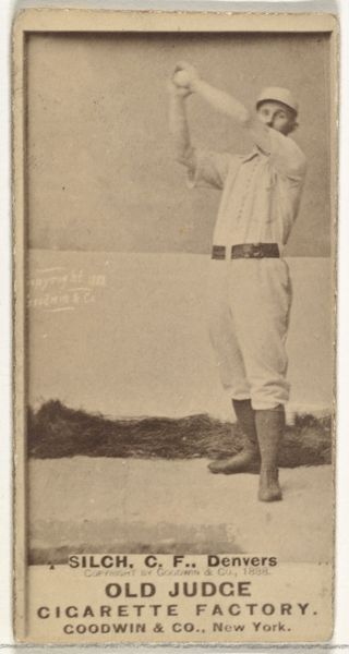Editor: So, this is “Jack McGeachey, Center Field, Indianapolis,” a gelatin silver print from 1887, originally a baseball card for Old Judge Cigarettes. It’s pretty beat up, which gives it a ghostly, vintage vibe. What strikes me is the stillness, almost a posed quality rather than an action shot. What do you see in this piece? Curator: The baseball player frozen mid-motion speaks volumes about the cultural moment it captures. Look at how McGeachey is holding the baseball. It’s a very particular gesture, reminiscent of depictions of saints holding orbs, globes symbolizing power and celestial authority. Here, the ball isn’t just an object; it’s becoming an emblem. Editor: An emblem of baseball? Curator: Yes, baseball, America itself, athleticism, masculine virtue, consumerism. The card, distributed with Old Judge Cigarettes, intertwined these things. The photo presents an idealized figure and his association with this specific cigarette brand; this makes it especially compelling, since the photograph’s age, combined with its original use in advertisement, offers us a layered image resonant with cultural significance, imbuing him with this power. Editor: So, you’re saying the baseball and even the cigarette brand elevate the player beyond just a portrait? Curator: Precisely. Objects accrue significance. Think about other athletes memorialized with items of apparel—shoes, bats. McGeachey and Old Judge are inextricably linked. By depicting him alongside his "equipment," they have immortalized him beyond the diamond! Editor: I never would have considered all those connections! Now when I look at this image, I consider what symbols are visible. Curator: Visual culture rewards us that way. Every mark is full of intention and meaning, and now, thanks to our discussion, perhaps we will all look at it with newer, critical eyes!