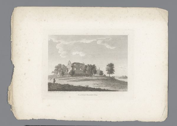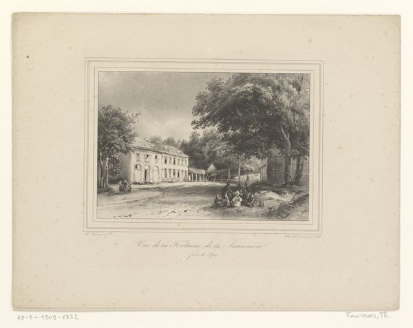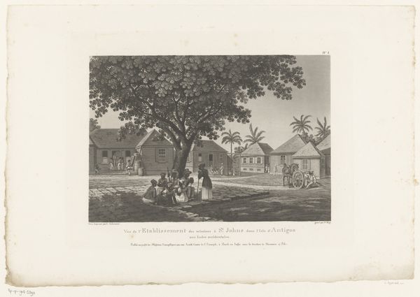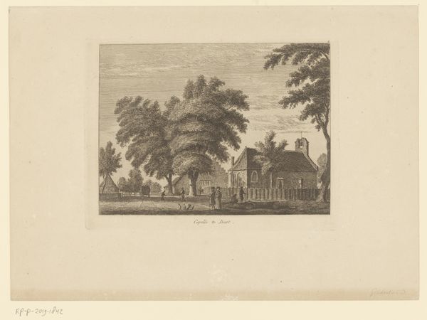Editor: This is "Man met gevogelte bij een huis in een tropisch land," made sometime between 1797 and 1836 by Philippus Velijn. It's an engraving currently held at the Rijksmuseum. It feels like a glimpse into a very different world, almost like a stage set. What kind of stories do you think this image tells? Curator: Indeed, it is a fascinating piece. Notice how the scene is constructed, almost like a memory carefully curated. The "tropisch land," presented through a Western lens, evokes the exotic, but is heavily mediated through architectural conventions. It raises questions: Who is the "man" and why is he placed at the periphery? Do the birds represent freedom, or perhaps a yearning for the untamed? Consider the engraving technique itself – the meticulous lines build an image, just as colonial narratives were carefully constructed. What enduring archetypes are being reinforced, and how do they influence our perception even now? Editor: That's a great point about the technique. It does feel like constructing an ideal. And I hadn't really considered how that reinforces a power dynamic. Curator: The symbolic language extends to the composition. The house, presumably a site of power, dominates the landscape. How does this compare to the figures that traverse through the bridge and roads? How might it resonate with psychological themes like control, paradise, and displacement? Editor: Now I am also wondering what type of power structure this signifies in terms of this house, people, birds, bridge. I think I see it differently now! Curator: Precisely. Engaging with art in this way makes us understand that historical context gives us a symbolic lens to look through when considering how visual information reinforces itself in memory and how we perceive it today.