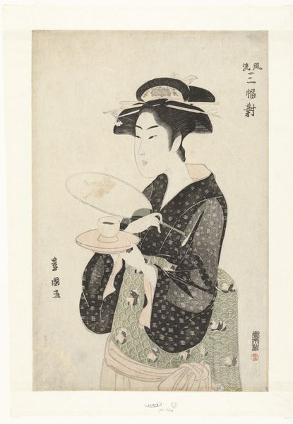 Kitagawa Utamaro created this woodblock print of a young woman with a fan. Utamaro was a master of ukiyo-e, a popular genre of Japanese art that flourished from the 17th through 19th centuries. The term translates literally as "pictures of the floating world," referring to the fleeting pleasures of urban life. Woodblock printing was a key technology for this art form. To make these prints, highly skilled artisans carved separate blocks for each color, and then carefully printed them in layers on paper. The subtle gradations of color and the fine lines, especially in the woman's hair, are testaments to the expertise required. The process was collaborative, involving the artist, block carver, and printer, each bringing unique skills to the artwork. Consider the labor involved: from the cultivation of trees for the blocks to the mixing of pigments and the precise registration of each color layer. Appreciating this print means acknowledging the many hands that brought it into being. In doing so, we recognize the profound relationship between art, labor, and the wider social world.