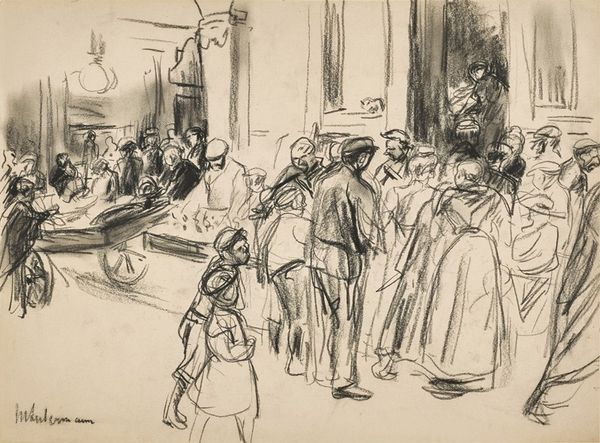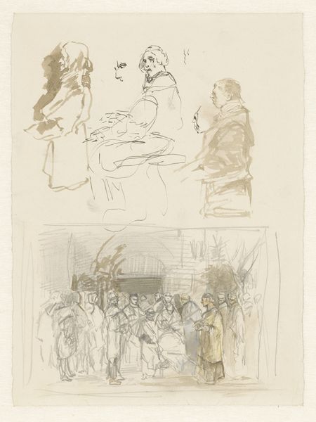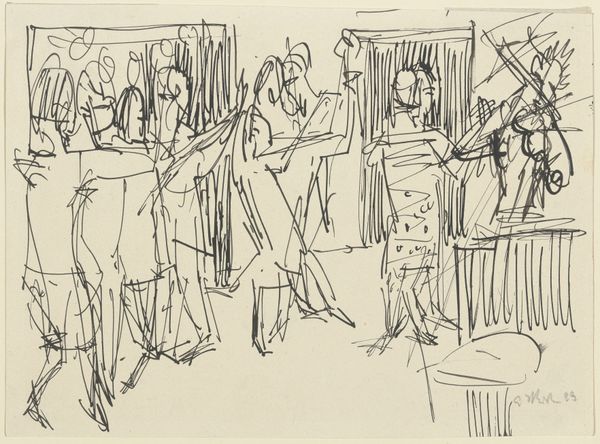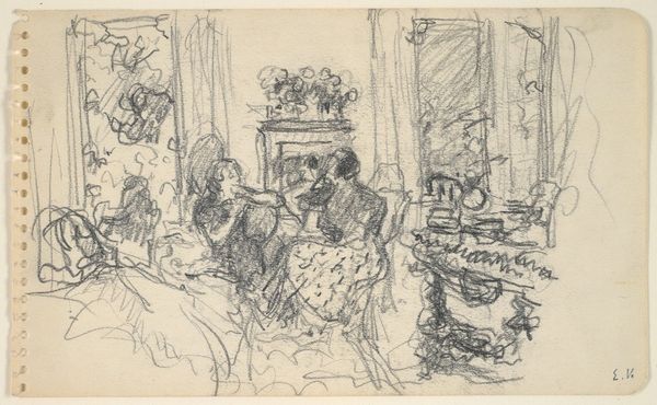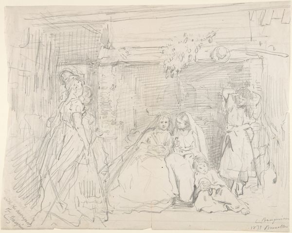 Editor: So, here we have Rodolphe Bresdin’s "The Convalescent," an ink drawing which dates anywhere from 1822 to 1885, held at the Met. The frenetic lines give the impression of a very busy, anxious interior, perhaps a bedroom scene? What social dynamics do you see happening here? Curator: The beauty of genre paintings such as this one lies in the way they offer us glimpses into the socio-cultural milieu of their time. I see here a stage, almost, and Bresdin presents a performance of care. We have figures surrounding what appears to be an ailing individual. Who are they? Consider the setting – it seems domestic and possibly upper-class, evident by the style of dress and the architecture. How do these details inform our understanding of healthcare and domestic roles during this period? Editor: It's interesting you frame it as a performance. I suppose the setting does feel very staged. What can we infer about access to care or even performative empathy from this snapshot? Curator: Absolutely. Think about the emerging role of the artist in the 19th century, a kind of social commentator. Is Bresdin critiquing or celebrating the acts depicted? Perhaps the scene reveals societal expectations surrounding illness and domestic life. The very act of capturing this moment implies the artist sees some social value, or perhaps something worthy of examination, in its portrayal. Why choose this scene to depict? Editor: I guess it makes sense that someone decided that was a worthy subject to depict, but I also notice the large window with people outside seemingly heading somewhere - as if the entire scene were staged and they just had to stand still to witness a very delicate moment? Curator: That adds another layer to the ‘performance,’ doesn’t it? The window isn’t just a source of light, but a barrier defining who is inside and outside this sphere of care. Bresdin subtly invites us to reflect on those boundaries and the privileges inherent in receiving or witnessing such intimate care. Editor: Thanks, this makes me see the piece as more than just a genre scene - it’s also a statement. It makes me wonder about other visual codes that underpin relationships, social support, and healing.