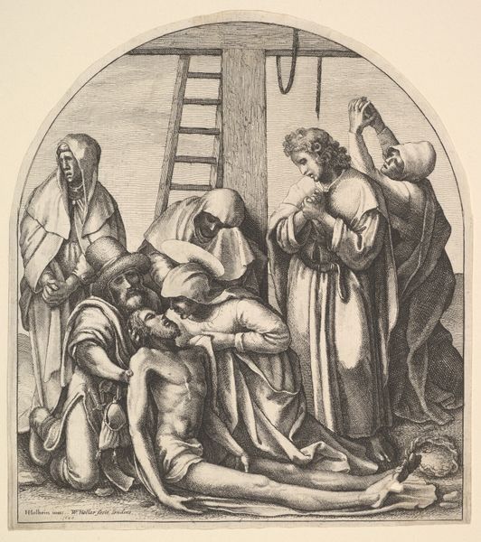 Charles Heath the elder created this engraving, "Cordelia and King Lear," illustrating a scene from Shakespeare's King Lear. The composition is strikingly intimate, rendered through the meticulous use of fine lines to create subtle gradations of light and shadow. The focal point is the reunion of Lear and Cordelia, their figures illuminated against the darker tones of the surrounding characters and drapery. Heath uses contrasting textures to differentiate the characters, drawing our attention to their emotional exchange. Consider how the formal arrangement here—the stark contrast between light and dark, and the almost geometrical placement of figures—serves to underscore themes of reconciliation and recognition in the play. Heath’s precise engraving captures not just the narrative moment, but also invites a deeper reflection on the semiotics of familial bonds and the visual codes through which emotional states are represented. It's an interpretation as much as an illustration.