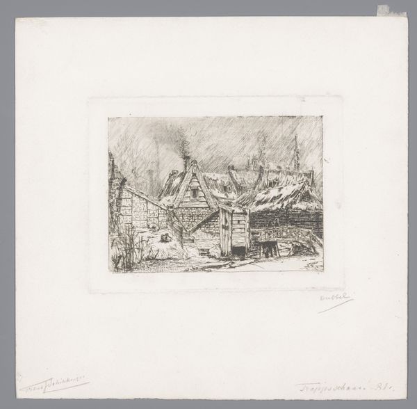 Editor: This is "Twee huizen op een heuvel" - "Two houses on a hill" by Maurits van der Valk, made sometime between 1867 and 1922. It's an etching, a drawing and a print, currently housed here at the Rijksmuseum. There’s a worn, almost fairytale quality to these buildings depicted, even though it feels very grounded. What do you see in this piece? Curator: I see echoes of time, etched not just in the lines of the work, but in the very subject it portrays. Notice the way the lines defining the stone seem to crumble, how the composition guides your eye through a landscape pregnant with history. It is more than just a cityscape, wouldn't you agree? Editor: Definitely. It's as though the stones themselves have stories to tell. So, how do you mean? Curator: This print uses architectural imagery not simply to document a place but to explore ideas about memory, permanence, and perhaps even decay. Consider the cultural symbolism of a house – a foundation, shelter, and lineage – all potentially fragile, weathering over time like this stone. Does this idea resonate for you? Editor: I guess it does. Like, are we looking at what's been abandoned? Curator: Perhaps abandoned or, more poignantly, transformed. Each chipped stone, each crooked line whispers of human interaction, use, adaptation. The beauty isn't merely in the houses but in the accumulated history they embody. Van der Valk is using them as vessels, really. Editor: It’s made me think of buildings in a totally different light, seeing them almost like faces marked by life. Curator: Indeed! Visual symbols are how cultural memories persist, aren't they? A testament to continuity within change. Editor: I’m going to spend more time considering how the old becomes beautiful in art.