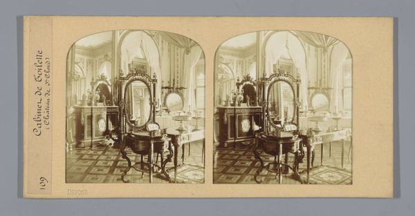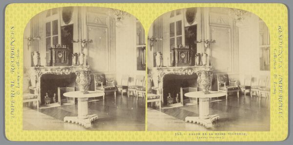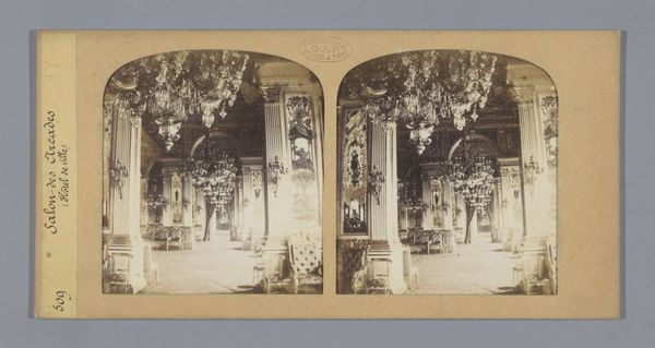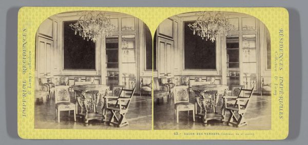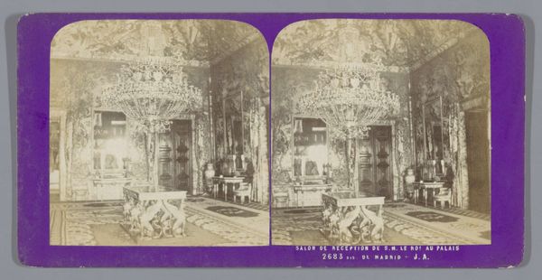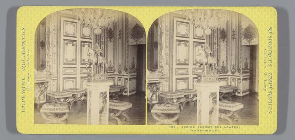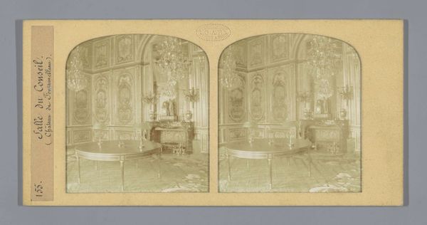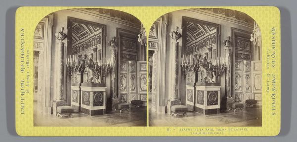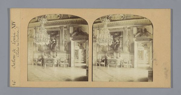 This is a stereoscopic photograph by Ernest Eléonor Pierre Lamy, capturing the interior of King Louis XV's chamber at the Palace of Versailles. The composition is structured by a play of light and shadow, emphasizing the room's elaborate ornamentation. The focal point is a sculptural equestrian figure which stands assertively atop a cubic plinth. The high contrast and monochromatic palette serve to highlight the textures and the interplay between hard, geometric forms and softer, organic details. The photograph's formal structure mirrors the hierarchical organization of the depicted space. The sculptor's technique creates a visual language of power and authority. Consider how the photograph invites us to reflect on the construction and representation of power through architectural and artistic forms. Ultimately, the photograph functions as a cultural artifact, documenting and interrogating the aesthetics and ideologies of its time. It prompts us to consider the ways in which space, objects, and images intersect to shape our understanding of history and authority.