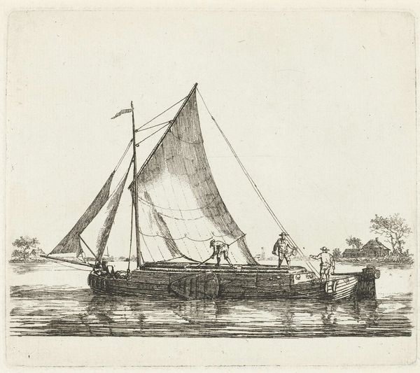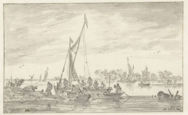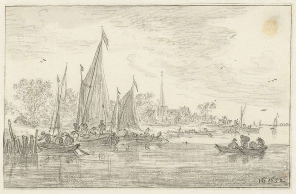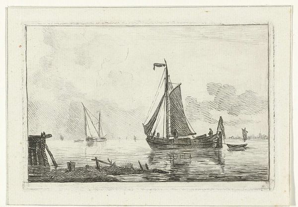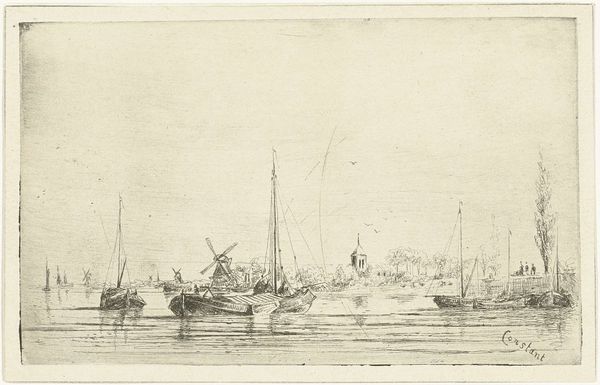 Editor: This is "River View with Boat and Rowboat," created sometime between 1856 and 1885 by Jan Daniël Cornelis Carel Willem de Constant Rebecque, using pencil, ink and etching. I'm struck by the sketch-like quality, particularly the varying densities of line work used to define shape and create depth. What are your thoughts on the compositional strategies at play here? Curator: The interplay of line, texture and form is indeed compelling. Note how the artist articulates depth primarily through modulation of tonal values, varying the density and weight of line to differentiate foreground and background. Focus on the surface. Do you observe any instances where the hatching technique flattens or conversely, enhances the perspectival illusion? Editor: Now that you mention it, the pier on the left seems less defined, with softer lines than the closest boat which creates some sense of recession, although the treatment of the water itself, with repetitive horizontal marks, doesn't really reinforce that effect. What about the use of negative space in the composition? Curator: Precisely. See how the negative space—the sky and water—isn't merely empty, but actively shapes the composition. The balance it achieves is somewhat contradicted by the darker tonalities of the boats. Consider the geometric tension produced by the masts and the way they articulate the space, but note also their simplification. Do they fully resolve in terms of accurate representation? Editor: Not entirely, it's true. It appears that the goal is to explore the expressive potential of the medium, rather than a perfect mirroring of reality. Curator: I agree. This examination illuminates how, through self-imposed limits, the artist prompts a dialogue about realism, challenging us to decipher its visual language. Editor: It's fascinating to consider how such simple lines can offer so much to analyze! Curator: Indeed, each viewing invites fresh appreciation for its formal sophistication.