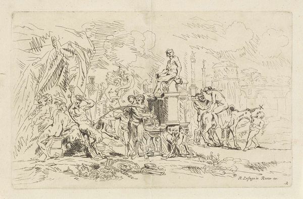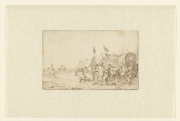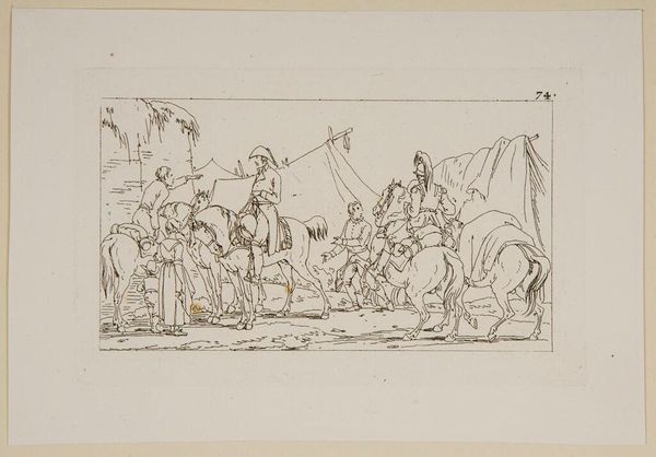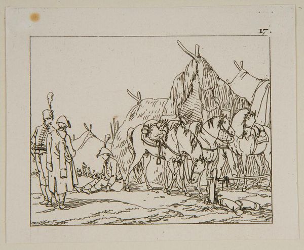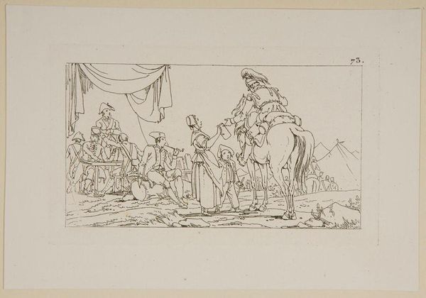 Editor: This is Jacques-Francois-Joseph Swebach’s "Plate XLVII," a drawing of what looks like a military encampment. The lines are so delicate, and the scene feels almost peaceful despite the subject matter. What stories do you think this image tells? Curator: This work speaks volumes about the lived experiences within military structures. The seeming peace you observe might be a veneer, masking the harsh realities of hierarchical power and potential violence inherent in such settings. Notice who is cooking, serving, and resting. How do these roles reflect gendered and class-based divisions within the military? Editor: It's true, there are definitely figures that seem to be performing very specific tasks. Curator: Exactly. Consider also the context of its creation. Was Swebach celebrating or critiquing the military? Understanding his positionality is key to deconstructing the image's potential ideological underpinnings. Editor: I hadn't considered the artist's intent beyond a simple depiction. It gives me a lot to think about! Curator: Indeed, questioning the artist's perspective helps us unravel the complex social dynamics represented.