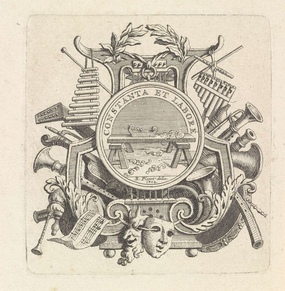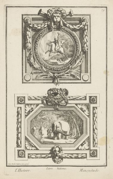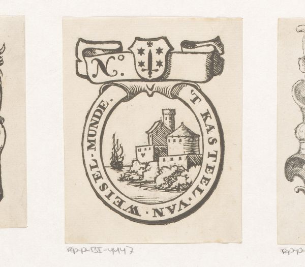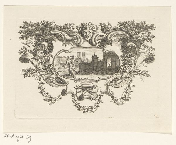 Editor: So, this is "Vignet met de stad Noyon in een cirkel met vruchten," a 17th-century engraving. It depicts the town of Noyon inside a circle wreathed with foliage and fruit. It strikes me as a really interesting blend of cartography and decoration... what grabs your attention about it? Curator: What truly sings to me is its quiet humbleness. Here we are, gazing upon what served, in its time, as both map and symbol of civic pride—yet rendered with such delicate, almost off-handed strokes! It’s as if the artist were whispering secrets of Noyon’s charm rather than shouting its importance. The little fruit and the ribbon on top give me the feeling it’s supposed to be some form of local label… don't you think? Editor: That makes sense! I hadn’t considered its potential practical application. The artist uses line and composition in a very interesting way. Curator: Precisely! It encapsulates a whole world within a tiny frame. What do you make of that perspective – a bird’s-eye view nestled within garlands? Do you think it elevates the town or domesticates it? Perhaps even something more...? Editor: I think it emphasizes the relationship between the town and its surrounding environment, but also its abundance thanks to those little fruits. Curator: Mmh, fascinating observation, Editor. So perhaps the engraver captured not merely the ‘where’ but the ‘how’ and even a hint of ‘why’ Noyon thrived? An engraver as an environmental psychologist, a master of placemaking. Editor: It's like a Renaissance precursor to those hyper-local branding initiatives of today, so interesting! I’m seeing so much more now.