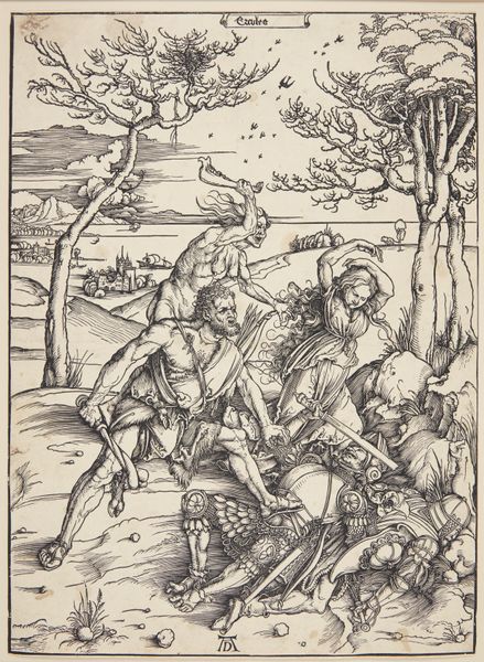 Curator: Here we have Hans Baldung's "Christ Nailed to the Cross," a woodcut created around 1507, now residing here at The Met. Editor: My gut reaction? Brutal. The scene is so immediate, so raw. You can almost feel the hammer blows. It's chaos and focused violence, all packed into this tight space. Curator: The image certainly reflects the anxieties of the time. It was produced during the early Renaissance in Northern Europe, a period marked by religious fervor and, frankly, a preoccupation with death and suffering. Prints like these, readily available, were used for private devotion and meditation, vividly depicting the Passion. Editor: Meditation? More like a full-on confrontation! Look at the contorted bodies, the exaggerated gestures. The torturers are rendered with grotesque intensity. There is not just drama but, theatrics even—as if it's staging a deep-seated primal rage. Curator: True, Baldung departs from idealized depictions of Christ. Here, he presents Jesus in a far more human, vulnerable light. Yet, his treatment, although harsh, speaks to the reformers of his time like Martin Luther or Huldrych Zwingli. The artist draws heavily on older tropes of the faith while moving to more of a "what you see is what is true" mode of communicating. It's as much about realism as it is about making it plain and accessible to the working folk. Editor: Accessible and jarring! Those faces in the crowd on the left, some are mournful, others are…blank, almost voyeuristic. It's that banality of evil that gets me. Even the landscape seems to shrink away, like it's repulsed by the scene. But do not mistake what is meant to be moving in Baldung's art, the violence meant to point a direct pathway to redemption. Curator: Indeed. It's a potent and emotionally charged work. I'd say, it captures not only the physical torment but the psychological weight of the crucifixion, reflecting a period of great societal upheaval. Editor: Leaving me with more questions than answers. But maybe that's the point, eh? A mirror reflecting humanity's darkness and its hope for light, no easy answers here.