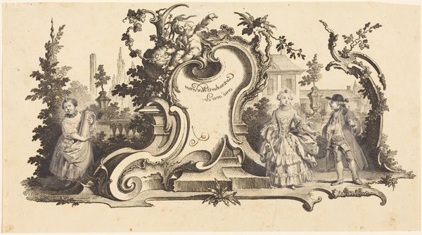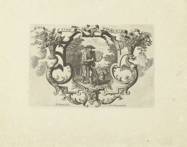 Bernard Picart created this print of Nicolas Boileau-Despréaux in a garden using etching, around the early 18th century. The composition features an elaborate frame of foliage and scrolls, within which a garden scene unfolds. The detailed linear work creates a sense of depth and texture, inviting us into a world of cultivated nature. Notice how the symmetry of the frame contrasts with the asymmetry of the natural elements depicted. The placement of tools above suggests themes of labour and cultivation, while the theatrical mask introduces an element of artifice. Picart uses the garden as a metaphor for the intersection of nature and culture, prompting us to consider how constructed spaces reflect broader intellectual and philosophical concerns. The detailed etching technique encourages close visual inspection, drawing us into a semiotic game of interpretation. How do these visual elements interact to challenge fixed meanings and values within the context of early 18th century aesthetics?