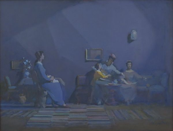 Here we see an undated painting by Omer Mujadžić, depicting a scene shrouded in a melancholic blue, where figures and objects emerge from the gloom. The most striking symbol is the portrait, itself incomplete, leaning against the wall, echoing the unfinished nature of memory and the passage of time. We see this motif across eras – consider the Roman tradition of ancestor portraits, imagines maiorum, which sought to immortalize lineage and virtue. Yet, here, the hazy, spectral quality suggests a fading connection to the past. The muted palette evokes a dreamlike state, a realm of the subconscious where personal and collective memories intertwine. This blurring of reality and memory echoes in the works of artists like Caspar David Friedrich, who also used landscapes to evoke deep emotional states. The painting thus becomes a meditation on loss, remembrance, and the enduring power of images to haunt our present.