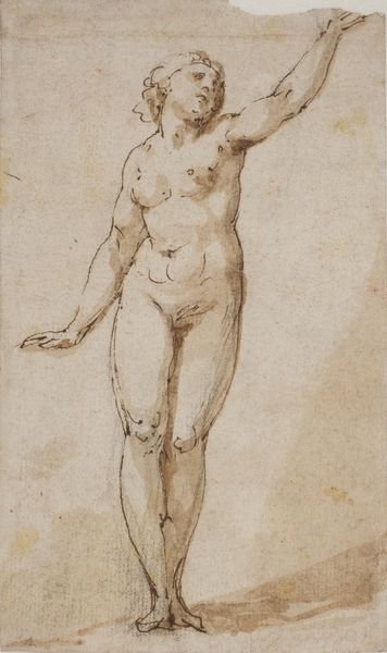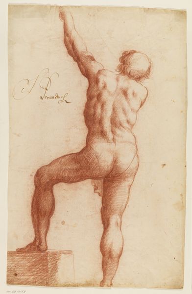 Editor: Here we have "Standing male figure leaning on a plinth to the left," a charcoal drawing from around 1600-1624, held at the SMK. It's an interesting study – immediately feels very classical. What's your take? What catches your eye about this drawing? Curator: Oh, you know, it whispers secrets of the Renaissance workshops. That subtle red chalk… it's almost like catching a glimpse of a fleeting memory. It reminds me of a story my grandfather told, about how he imagined Michelangelo's workshop felt to him, a hub of creativity. And this figure... isn't he caught in a moment of profound contemplation? Perhaps pondering a lover or the future. Editor: Contemplation, yes, that resonates. The pose is so…unresolved, like he's caught mid-thought. Is this about idealized beauty or something more human? Curator: It’s the eternal dance, isn’t it? This era loved wrestling with the ideal, but they always brought it crashing down to earth. The weight he places on the plinth. That simple action suggests his body might not match his mind’s ambition. Do you feel he’s more mortal because of that? Editor: Perhaps. So it’s not just about aesthetic beauty, but the push and pull of the human experience? Curator: Exactly! Art is a dialogue – always. That figure yearns, reflects, poses even, and the unknown artist asks questions. What is humanity but a quest for self-understanding played out against the grand stage of time and marble dust? And that plinth isn't just for resting a weary arm – but also for raising this figure to an unattainable perfection! Editor: That’s such an elegant thought. I came in just seeing a classical nude study, and I’m walking away thinking about human imperfections. Thanks! Curator: It's like poetry, each glance unlocks a new rhythm. The drawing revealed secrets, as it does with any viewer who gazes long enough.