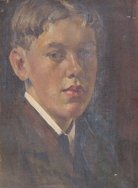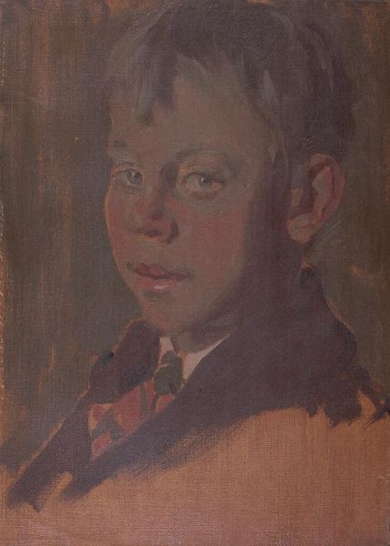 Editor: Here we have an oil painting called "The Newsboy" by George Bellows, its exact creation date is unknown. The boy's gaze is so direct; there's a kind of defiance mixed with vulnerability that really strikes me. What do you see in this piece beyond just a simple portrait? Curator: It’s a compelling image, isn't it? Bellows was part of the Ashcan School, a movement dedicated to depicting everyday life, particularly the lives of the urban working class. Considering the social and economic context of the time, this isn't just a portrait; it's a representation of child labor, poverty, and the gritty realities faced by many young people. This boy is selling newspapers, contributing to his family's survival, and Bellows confronts us with that reality head-on. Do you think his expression hints at the hardships he's enduring? Editor: That's fascinating. I hadn’t really thought about the social commentary aspects beyond it being a realist painting. Now that you mention it, there is something more profound happening with the subject's direct gaze, sort of a forced maturity brought on by circumstance. Curator: Exactly. Bellows isn’t romanticizing poverty, instead the gaze challenges our assumptions. It invites us to consider the systemic inequalities that push children into the workforce, stripping them of their childhood. Does that understanding shift how you perceive the visual composition, the darker tones? Editor: Absolutely. Knowing the social context illuminates how Bellows uses realism to convey a powerful political message about societal issues. I will never see paintings the same way again. Curator: Indeed. Art can be such a profound tool when it encourages questions about identity and societal inequities.