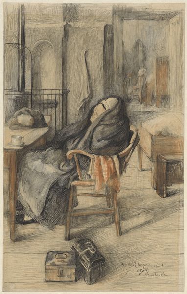 Editor: Here we have Jean-François Raffaëlli’s “Portrait of the Sculptor Auguste Rodin in his Studio,” dating to around 1889, currently housed at the Art Institute of Chicago. I find it fascinating how Raffaëlli captured the act of creation, with Rodin completely absorbed in his work. How do you approach understanding a piece like this, focused on another artist? Curator: I'm drawn to how the work portrays Rodin's studio as a space of labor, where art is produced. Consider the visible materials: charcoal, ink, gouache, all used to depict Rodin’s own sculptural practice. The drawing itself becomes a document of the artistic process. Raffaëlli is not just creating a likeness, he's presenting Rodin at work, within the physical context of his production. Think about the stool and its tray: are they just props, or do they point to a whole network of production? Editor: That's a good point, I hadn’t considered how much the studio contributes. So it's not just about Rodin’s genius, but also about the tools and environment that enable that genius? Curator: Exactly. What kind of impressionist strategies of making is Raffaëlli using to show a peer at work? Notice the loose, visible mark-making. Raffaëlli is representing the textures of both Rodin's sculpting materials and his own drawing tools. Consider what it says about artistic labor at the time – this wasn’t just inspiration, but craft, a kind of ‘working man’ vision. Editor: So the materials used in the portrait, mirror the materials and practice of Rodin? Almost a form of homage by shared physicality? Curator: Yes, consider it as an act of artistic solidarity shown through materials and labor. In its time period, the emphasis was changing from the old Academy vision of sublime subjects and mastery to the everyday world, but there was also the rising trend of ‘art for art’s sake.’ What are your thoughts on that position, and this work? Editor: It’s interesting to think of Raffaëlli commenting on that by connecting the grand art with the labour-intensive practice of it. It brings a new perspective on portraits of artists I hadn’t considered before. Curator: Precisely, we start looking beyond representation to engage with the tangible conditions of artistic production.