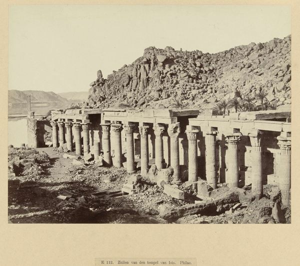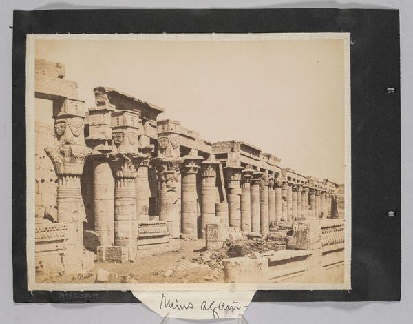 Editor: This gelatin silver print by Antonio Beato, taken sometime between 1862 and 1895, captures the colonnade of the Temple of Isis on Philae Island. The sheer number of columns really strikes me; the picture plane seems entirely filled with them, which creates an impressive sense of scale, but it's still kind of overwhelming. What do you make of it? Curator: Note how the columns present an interplay between mass and interval. The repeated verticality sets up a powerful rhythm, countered by the horizontal thrust of the architrave above. Editor: I see what you mean, especially with how the gaps between each column interact. Curator: Indeed. The architectonics here are paramount. Consider the geometry: the cylindrical forms of the columns, capped by the rectangular weight above, softened by the intricate carvings and stylized faces. Ask yourself, how do these shapes interact to convey monumentality and also hint at human presence? Editor: I guess I see it now; there’s a rigid structure but then these decorative carvings that almost soften that feeling. It becomes something visually impressive but that's still on a very human level, do you agree? Curator: Precisely. The very limited tonal range forces our eye to appreciate subtleties of texture and form, thereby distilling the essence of the architecture. The very light colour pallet becomes the vehicle to achieve this. Editor: Looking at it that way, it really pulls together into something visually striking. I came in thinking it was cluttered, but seeing the way that all comes together really changed my mind. Curator: Agreed, it exemplifies the photographer’s keen eye for structural harmony and surface detail, transforming a historical relic into a composition of lasting visual interest.