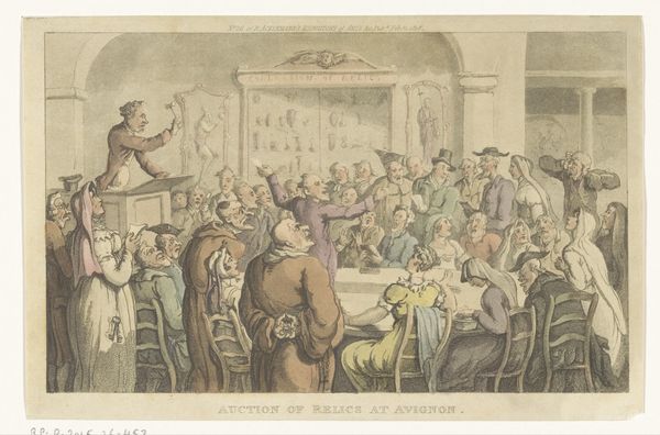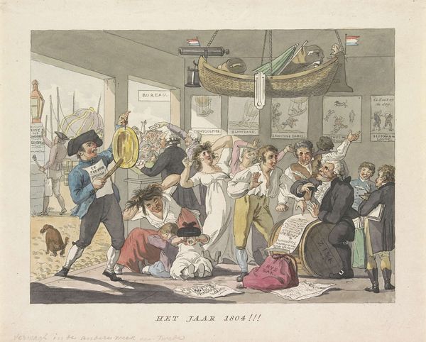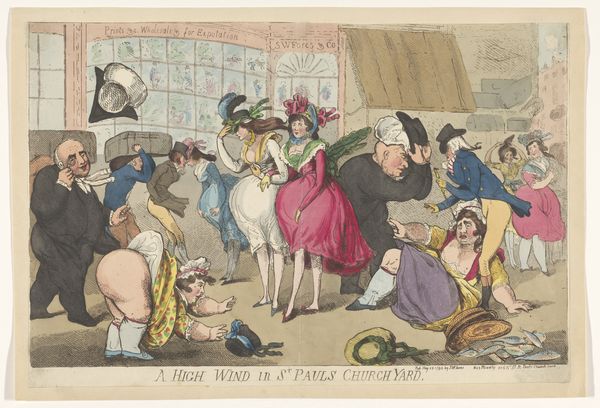 Curator: Look at this swirling mess, this eruption of bodies! What's your initial gut reaction to it? Editor: Absolute chaos. And strangely... performative. It’s all so theatrical, even for a brawl. The title "The Gig Shop or Kicking up a Breeze at Nell Hammiltons Hop" suggests a party turned completely upside down. It looks like Thomas Rowlandson might have created this around 1811. Curator: Right, Rowlandson did love capturing these scenes of everyday life spiraling out of control. He renders them so vibrantly! It's an etching, printed on paper, so accessible. No precious oil paints here, making it perfect for widespread distribution as social commentary. Editor: Absolutely. Etchings allowed for multiple impressions. He's not just making art, he's creating a commentary to be consumed and debated. I'm intrigued by the printing process itself. Notice the fine lines—that level of detail comes from careful application of acid onto the metal plate. These kinds of details elevate it above simple caricature. Curator: You are so right about the detail! And Rowlandson really leaned into caricature here, pushing the figures to the edge of absurdity. I see the romantic interest, history painting and the genre painting, like he wanted to touch upon a specific tone but the beauty for me is to understand how everything it goes so wild! It makes you wonder what set it all off. A misplaced foot during a dance? Too much punch? The fallen woman is an attention getter to all the picture. Editor: Well, let's think about the social context of 1811 England. There’s clearly a mix of classes represented here. Some dressed finely, others look to have been made by low budget production means... like art, even at that moment... Does this chaotic "hop" represent anxieties about social mobility? Rowlandson, like many artists then, often critiqued social norms and class divisions. Curator: Perhaps. Or maybe he just enjoyed a good, messy story! The expressions are everything! Those wide eyes, the contorted faces... pure, unadulterated… joy? Anxiety? The chandelier hanging above it all seems to flicker a dark thought or two! I wonder whether he was trying to channel something very dark and raw. Editor: Well, looking at it through a materialist lens, perhaps it's about excess, production, and consumption… these kinds of wild celebrations surely come with some type of human and labor exploitation… Curator: Indeed. Well, it definitely gives us something to think about. Perhaps next time we're at a party, we can be just that little bit more aware. Editor: Indeed! Because, at the very least, materials and context change… But humans and excesses probably never will…