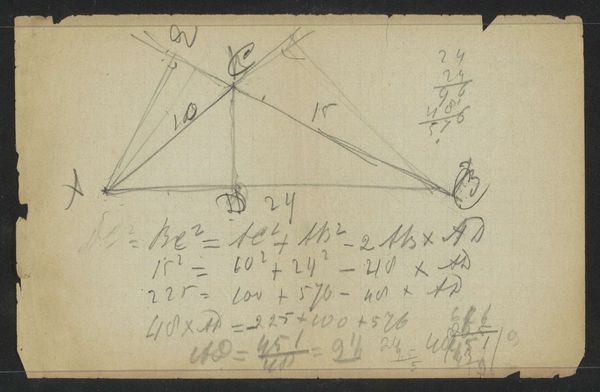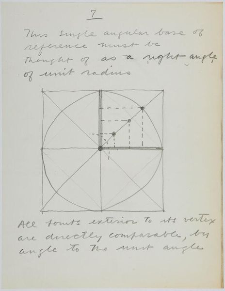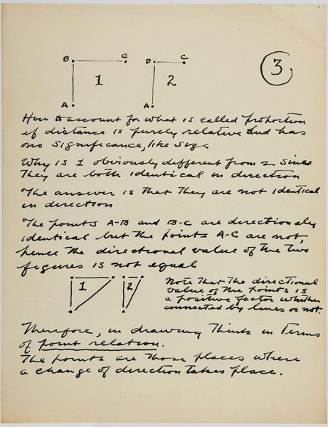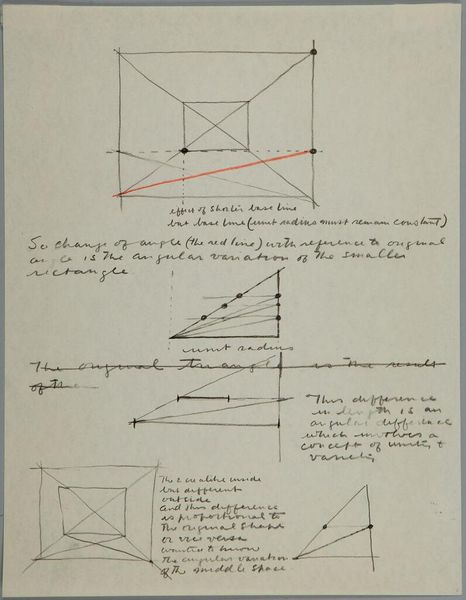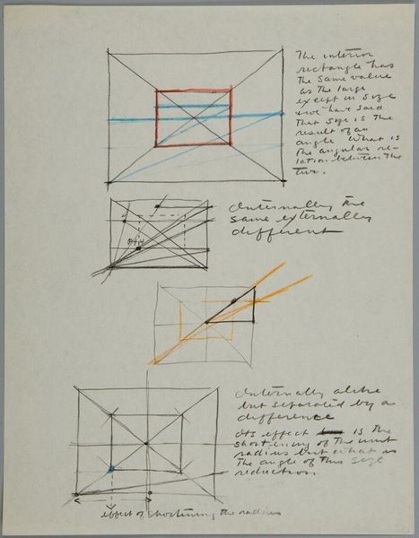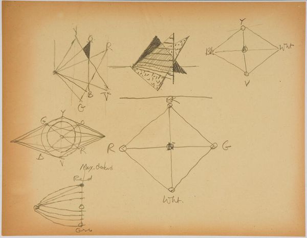 Editor: So, this is "Color-Space Cube Diagrams" by Stuart Davis. It looks like a page of notes, maybe a study, with geometric shapes and handwritten text. What do you see in this seemingly simple sketch? Curator: It's fascinating how Davis, known for his vibrant canvases, explored color theory through these diagrams. Consider the historical context: early 20th-century artists were deeply engaged with ideas about perception and space. How might these diagrams relate to Davis's broader artistic project and the development of modernism? Editor: That's a great point! It does feel like he's trying to break down the fundamentals of color and form. Curator: Exactly. And think about the "public role" of art. Davis is trying to define the nature of color, and the political implications of art reflecting a reality back to the population. Editor: I never thought about color theory as having political implications. That's something I need to research further. Curator: Indeed. It reveals that even a sketch like this is the result of a wider social and intellectual pursuit.