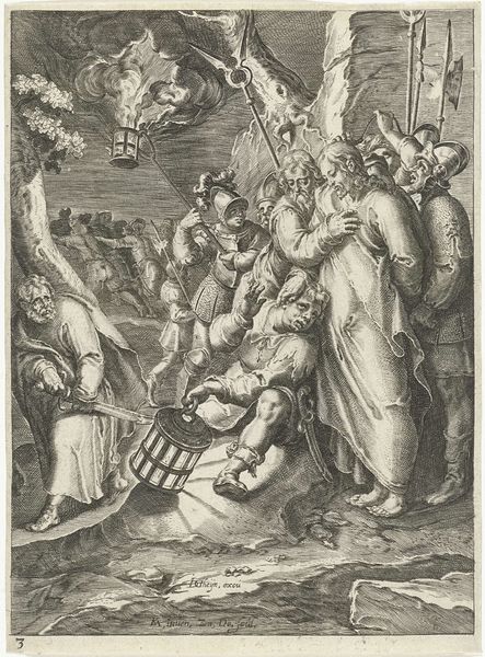 Rombout Eynhoudts created this print, "Cambyses punishing the unjust judge Sisamnes," referencing a story from the ancient Greek historian Herodotus. The artwork is steeped in the complex social dynamics of 17th-century Europe. At its core, this image is about power and justice. Sisamnes, the corrupt judge, is punished for his greed and dishonesty. This scene invites us to reflect on the relationship between rulers and the ruled, between justice and vengeance. How does one maintain order and prevent corruption? Eynhoudts asks us to bear witness not just to the execution, but to the implications of such a brutal act. The story suggests that true justice is not just about punishing the guilty, but also ensuring that the system itself remains fair and equitable. The emotional weight of this scene is undeniable, and Eynhoudts ensures that the viewer feels the heavy burden of justice served.