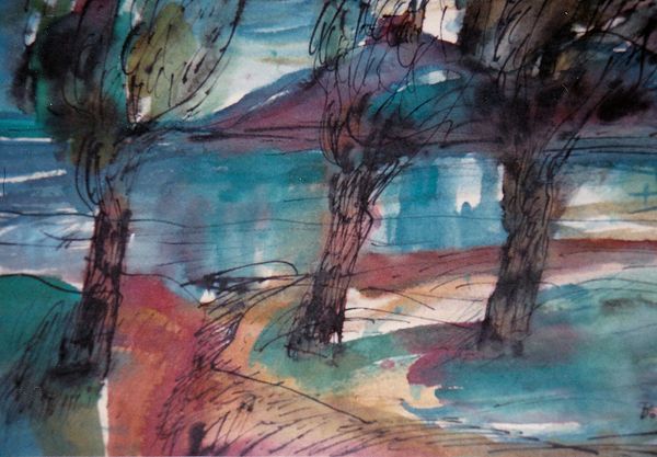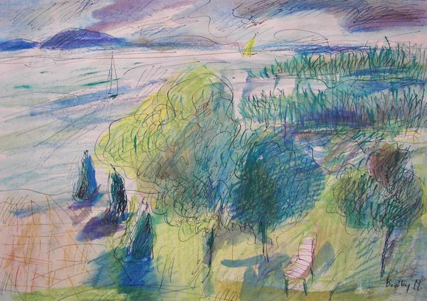 Curator: Here we have Maria Bozoky’s watercolor piece, "Migrating Starlings," completed in 1981. The piece employs what appears to be a plein-air approach to capturing the landscape. Editor: Oh, it has a dreamlike quality! The colors feel both vibrant and muted, and those thin lines give it this nervous energy, almost like the wind is about to pick everything up and blow it away. Curator: Bozoky’s treatment of light and color is really what makes it stand out. The ethereal washes suggest a focus on capturing fleeting moments and the overall atmospheric conditions. Watercolor as a medium allows for an unparalleled freedom when dealing with capturing light effects and movement, which is clear from the gestural line-work visible in the tree on the left. Editor: Absolutely. The pinks and blues, the bare branches – it reminds me of childhood winters. It’s not just what’s depicted, but how – the way the water and pigment bleed into each other, creates a sense of memory, hazy and incomplete, you know? Curator: Considering her broader body of work, one might read the choice of watercolor and this delicate treatment as a deliberate commentary on the relationship between nature and artistic production itself, almost highlighting the ways these materials work in conversation with each other. Editor: You know, there’s something quite romantic about that approach – this idea that the artist is essentially surrendering to the material, allowing it to dictate the final form. Curator: Indeed, there is a marked focus here not only on the aesthetic result but the performative element of "doing". You might read the Romantic underpinnings within that mode of engagement, which foregrounds subjectivity, individual perspective, and emotional resonance within the experience of seeing the work of art. Editor: Well, seeing it like this, with a lens focused on the processes and social meanings involved… changes things. Curator: Perhaps it’s about reminding us that art isn’t just about seeing, but about how and why we see, what labour that entails for both maker and consumer.