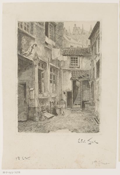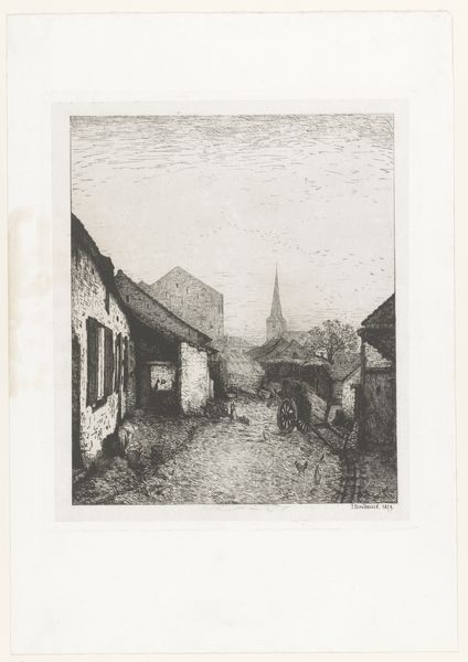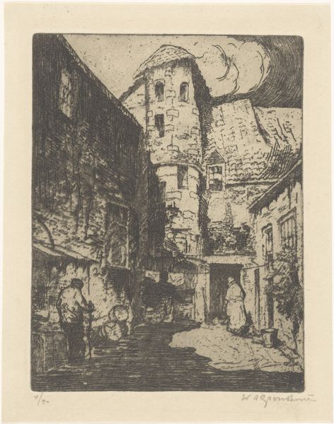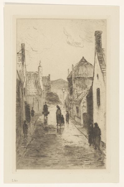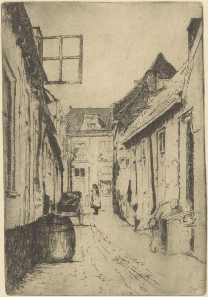 Editor: Here we have "Hattem," an etching by Willem Adrianus Grondhout, made sometime between 1888 and 1934. The use of hatching and cross-hatching is really striking and creates a nice depth of field, don't you think? It definitely makes me wonder how Grondhout built the tones across this narrow street scene. What compositional techniques stand out to you? Curator: The print is definitely an engagement in texture and light. Note the rhythmic application of lines; their orientation shifts deliberately to construct forms. Consider, for instance, how the artist used the drypoint to create a palpable sense of depth on the paved street in comparison with the smooth portions on the gable ends. The formal contrast between the textures serves to divide the image into specific visual zones. Does this controlled handling of textures not resonate with the detailed facades that define the character of the buildings in Hattem? Editor: It certainly does! Now that you mention it, I notice how the varied textures give individual personalities to each building lining the street, don't you agree? It's like each structure is breathing. I initially overlooked it. Are you saying that the print echoes the real architecture, so in effect it recreates a sense of reality, one rooted in form and matter? Curator: Precisely! Grondhout isn't merely replicating a cityscape; he's offering a carefully constructed reality using variations in texture. His structural and textural language provides us with cues to interpret and engage with the depicted scene, don't you agree? Editor: Definitely! It’s incredible how much attention he paid to what makes each structural form stand out, making it feel lifelike. I'll definitely look closer at how artists create varied surfaces within their prints moving forward.