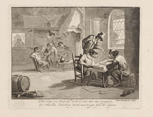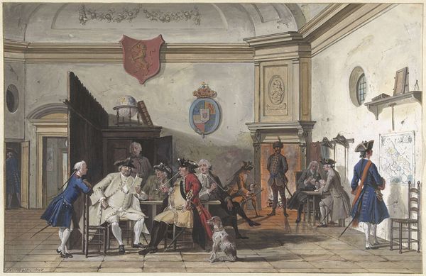 This lively scene was rendered by Jan Anthonie Langendijk Dzn with pen, brush, and watercolor. These were typical tools for artists to capture daily life, and allowed for easy replication through printmaking, essential for circulating images in the 18th and 19th centuries. Langendijk's choice of watercolor is key. Its translucent quality lends a sense of immediacy and informality, perfectly suited to depict the bustling energy of the tavern. Each stroke of the brush captures a different facet of life in the inn: the musicians playing, the dancers, and the figures imbibing around a table. The artist likely made numerous preliminary sketches, capturing the expressions and gestures of the figures from real life. These would have been translated into a final drawing, before being brought to life with delicate washes of color. The artist gives us a glimpse of everyday life, labor, leisure, and the exchange of goods and services during that period. It invites us to consider how images like these were circulated, consumed, and used to shape perceptions of everyday life. By looking closely at the materials and processes, we gain a deeper understanding of the art itself, and its role in society.