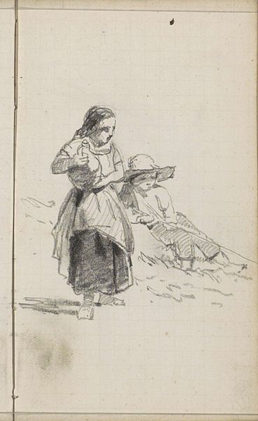 Curator: Willem Witsen's "Twee studies van een vrouw met takkenbos," created circa 1884-1887, captures a figure rendered in delicate pencil strokes. It's part of the Rijksmuseum's collection. Editor: Immediately, I’m struck by the starkness of the composition. The contrasting textures of the woman’s garments and the rough branches create a visual tension. There's an almost ghostly quality to the sketches. Curator: I'm particularly interested in the implications of Witsen choosing a readily available material like pencil for this genre painting. How does the act of sketching itself, its inherent temporality, influence our understanding of labor and representation here? Editor: I’m more interested in how the pencil work affects our understanding of form. Note the distinct lines used to define the woman’s figure compared to the more gestural rendering of the branches. It directs our gaze, structuring our perception of the subject. Curator: Precisely, and I think that differentiation reveals a deeper commentary. Witsen highlights the social stratification and the manual labor that underpins the depicted reality. We need to ask what purpose she will use these twigs for? What choices does this working-class woman even have? Editor: An interesting interpretation! My perspective is that Witsen is masterfully using contrast. The way light and shadow play across the planes of her face suggests resilience, while the soft, blurred background draws attention to her stance—an exploration of form guiding the eye. The humanism of this is the interplay of textures and the woman's firm gaze. Curator: But it’s through those contrasts that we can discuss class divides, understand the availability of resources. Even the paper of a sketchbook tells a story, placing limitations on how these working-class figures get memorialized by artists such as Witsen. Editor: Regardless, the artist manages to distill the scene into a powerful statement using fundamental formal elements like line and value. Curator: I agree; even within this limited medium, Witsen prompts us to consider how even in Realism the labor that everyday people conduct for survival makes itself evident. Editor: And ultimately it also gives the viewer a deeper appreciation of visual form. Thank you for your time!