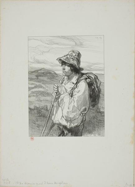 Curator: Gavarni's "Analfabeet bekijkt op een kade uitgestalde boeken," from 1858, is more than just ink on paper; it's a window into a soul, isn't it? Editor: It really is. The scene shows an illiterate man observing books displayed on a quay. It feels so… poignant, almost melancholic. What do you make of it? Curator: The texture is crucial, no? The lines feel like whispers of Romanticism, carrying a profound weight. Observe the body language: the hands tucked into pockets, the averted gaze… the whole drawing is weighted with yearning, or perhaps a certain resignation. Is it simply a social commentary, or does it touch upon something deeper within us? Have you ever felt like you’re on the outside looking in? Editor: I suppose that universal feeling really hits home. I wonder if the artist was trying to evoke a sense of empathy? Curator: Indeed. The city—probably Paris—humming in the background, almost indifferent to the plight of this individual. Do you think it speaks to the elusiveness of knowledge, maybe the limitations imposed by societal structures? He sees the books, but he cannot unlock the stories they hold, their power to transport him somewhere else. I like that ambiguity. It lingers with me, somehow. Editor: It's really interesting to think of it that way. It’s a piece that definitely grows on you the more you examine it. Curator: Exactly! Gavarni manages to turn a simple scene into an existential question. Art doing what it should – making us question our reality, and perhaps, even our place in it. Editor: Well, I definitely won't look at old books the same way again. Curator: Or the people who can't read them.