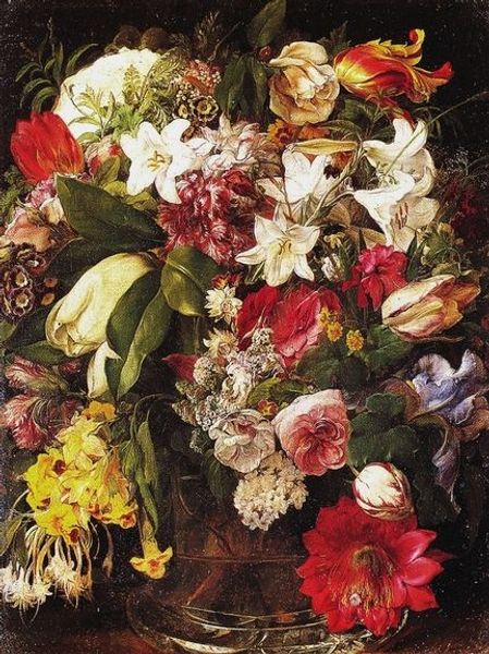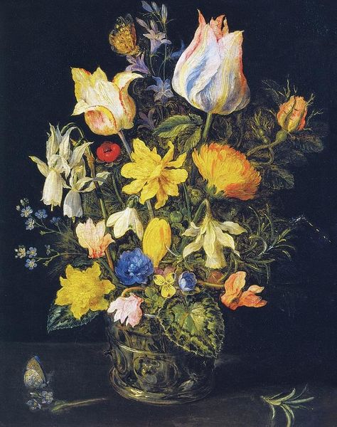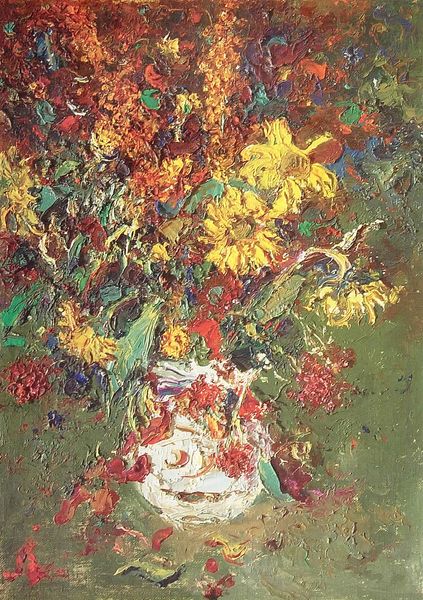 Editor: Here we have an oil painting entitled "Autumn berries and flowers in brown pot" by John Constable. It strikes me as a surprisingly subdued still life, given the vibrancy we often associate with floral paintings. The tones are so rich and earthy. What's your take on this piece? Curator: Subdued is a fantastic observation! To me, this painting feels deeply personal, a quiet reflection on the beauty of fading light. Constable wasn't just arranging pretty things; he was capturing a specific, fleeting moment in nature, almost like preserving a memory. You can practically smell the damp earth and hear the rustle of leaves. Notice how he uses light, almost cradling the flowers, pulling them out of the shadows. Editor: Yes, I see it now! It's almost as if he's focusing on the poignancy of decay, rather than the usual idealized perfection of flowers. Curator: Exactly! And that's what makes it so moving, don’t you think? It’s not just about beauty, but about the whole cycle of life, withering included. He really wants us to see those colours fade into the gloom as though they were fading in a memory. Is it making you think differently? Editor: Absolutely. It’s made me think about still life in a completely different way. It's not just a decorative exercise, but an emotional one, too! Thanks for opening my eyes to this. Curator: My pleasure! It reminds me that even the most everyday things can hold profound beauty and meaning if we only take the time to look.