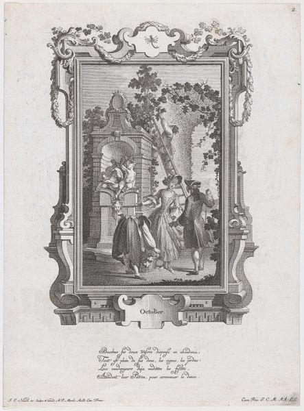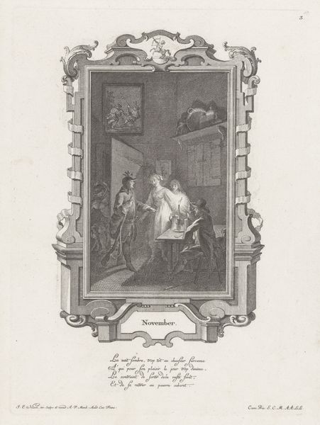 Editor: Here we have Johann Esaias Nilson’s “December,” an engraving from 1766, residing at the Rijksmuseum. It's quite detailed, and the framed image evokes a sense of domesticity during the winter months. What jumps out at you when you look at this print? Curator: It's fascinating to consider this work through a materialist lens. Engravings like these were products of a very specific and demanding labor process, involving specialized skills and tools. Consider the societal context: this wasn't just about creating an image, but about reproducing and disseminating it. Who was the intended audience, and what access did they have to the materials and processes depicted? Editor: So, you're suggesting we think about who could afford this kind of print, and what that says about the people it depicts? Curator: Exactly. The print visualizes a gathering; yet, the image itself became a commodity. How does that affect our interpretation? Furthermore, the labor of creating the engraving often goes unacknowledged while the artist garners attention. Consider the engraver’s skill. Each line, each mark, represents physical and intellectual labor. It transforms raw materials into an accessible, reproducible image. Where does that fit into the typical art historical narrative? Editor: That’s an interesting point – thinking about the usually unseen work behind the scenes. So the circulation of prints became this early form of mass media… Curator: Precisely. How did prints like this shape perceptions of everyday life and seasonal activities? Whose story is not told? Do the conditions of production amplify or distort the narrative of 'December' represented within the image itself? Editor: I never considered how the labor of creating and consuming this image shapes the picture itself. Curator: Indeed. By focusing on the materials, production and the social conditions surrounding “December,” we can move beyond conventional readings and toward a deeper understanding of its place within a broader cultural landscape.