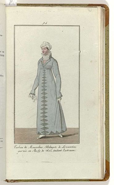 This print, made in 1808 by an anonymous artist, depicts an elegant woman's fashion from the Dutch magazine 'Elegantia'. It reflects the cultural values of the time, where fashion played a significant role in expressing social status and taste. The print showcases a woman in a 'Toque de velours, Redingote à la Polonaise', highlighting the luxurious materials and intricate design that were fashionable among the elite. The magazine itself, "Elegantia", was an institution that shaped and disseminated these trends. Its existence points to the growing importance of fashion as a commodity and a form of cultural expression. Consider the socio-political context: the Napoleonic era influenced fashion trends across Europe. The "Redingote à la Polonaise" suggests an interest in foreign styles, perhaps reflecting the cosmopolitan nature of the Dutch elite. Historical sources like fashion magazines, personal letters, and economic records can give us a deeper understanding of the social conditions that shaped this artwork and its cultural impact. Artworks like this are valuable records of cultural and institutional history.