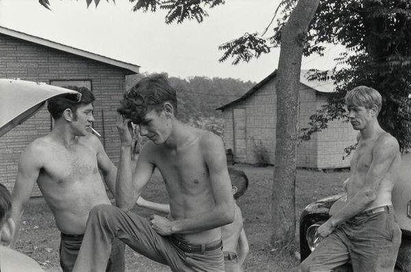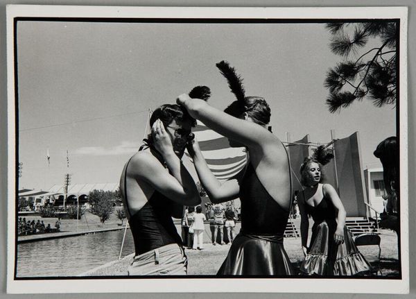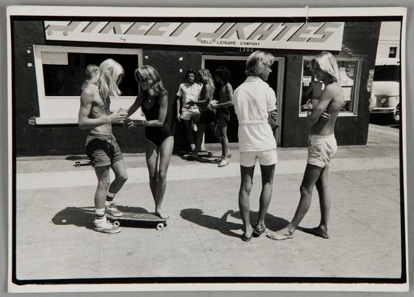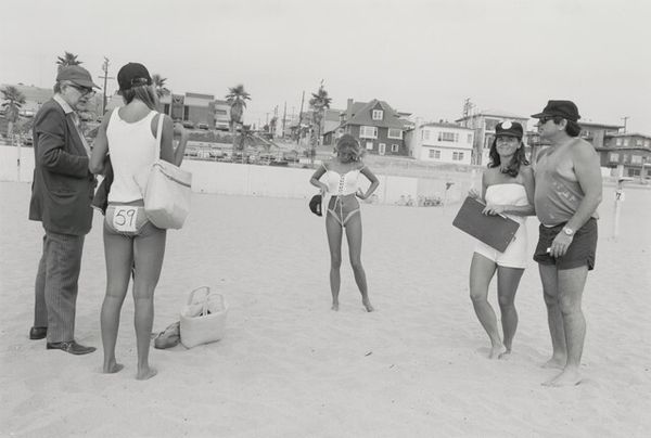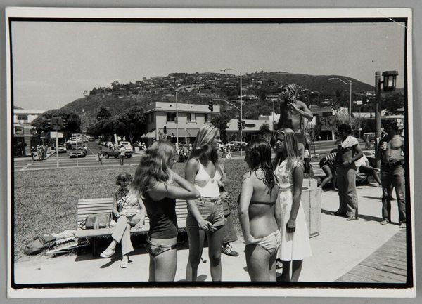 Curator: This black and white photograph, simply titled "Manhattan Beach," was captured by Tod Papageorge in 1978. He worked with gelatin-silver print. Editor: My first impression is one of candid awkwardness. The scene is busy but the individuals seem disconnected, captured in these raw, unposed moments. The starkness of the monochrome contributes to the gritty feel. Curator: I see that. Papageorge often sought to capture the everyday realities of urban life. Examining it through the lens of intersectionality, there's a clear socioeconomic story unfolding. The beach, typically a site of leisure, is presented with working class interactions in full view. We see varying body types and expressions that feel real, and that really democratizes representation. Editor: Definitely, the lack of glamorization contributes to that raw feeling. But the symbols, like the beach service menu with prices frozen in time and the logo of the Royal Crown cola brand, work like hieroglyphs, evoking specific associations for certain viewers rooted in nostalgia. Curator: And gender too, is at play here. You notice the overt gazes. The group of younger girls seemingly together are almost being exhibited. Editor: Indeed. It is impossible to separate gender from that reality. Their expressions communicate boredom or the quiet experience of being exposed. There's a story about visibility and vulnerability that emerges when you really consider this as more than just an image of beachgoers. Curator: I agree. What began as a snapshot of a moment reveals how historical forces, gender dynamics, and even economics can become etched into a single image. Editor: For me, it’s an invitation to decode the iconography of the late 70s. An artifact that carries layers of cultural meaning we’re still unpacking today.