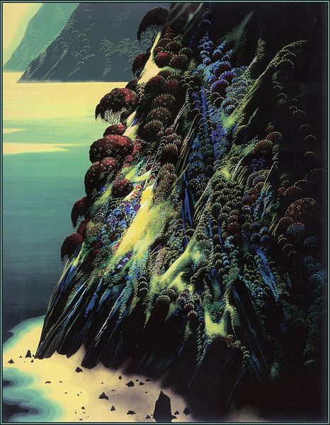 Eyvind Earle created "Stardust Blue" without a known date, presenting a landscape rendered in serene blues and greens. This image invites us to consider the evolving relationship between art and nature, particularly in mid-20th century America. Earle's stylized mountains and slender trees evoke a sense of idealized wilderness. The image is less a direct representation of nature and more a carefully constructed vision. Such idealized landscapes gained prominence during a period marked by increasing industrialization and urbanization. Artists and the public looked to nature for solace. During this time, American institutions shaped art's reception through museum exhibitions and art education. This image, like others from its time, reflects a nostalgia for untouched landscapes. Earle likely drew on his experiences and broader cultural anxieties about the changing environment. To understand "Stardust Blue," we might explore period publications, environmental histories, and exhibition records. These resources would reveal the social and institutional contexts that shaped both its creation and reception. Art like this prompts us to reflect on our values and environmental responsibilities.