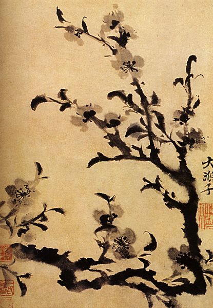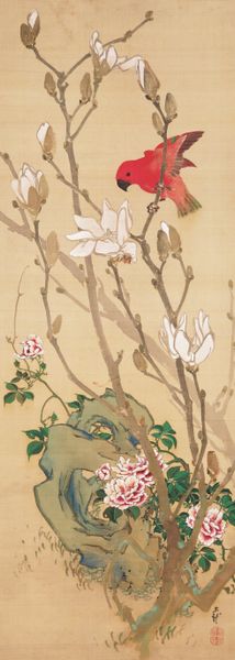 Utagawa Hiroshige created this print, Yellow bird and cotton rose, shaped like a fan using woodblock printmaking. The composition strikes a delicate balance between asymmetry and harmony. Notice how the deep blue sky contrasts with the yellow of the bird and flowers, drawing our eyes across the picture plane. The artist positions the bird as if it were bowing towards the flower, creating a sense of dynamic movement. Hiroshige uses line work to define the forms of the petals, leaves, and feathers. These lines aren't just outlines, they also describe the textures and contours of the subjects. Japanese art often incorporates text as a design element. Here, the script at the top left mirrors the curve of the fan shape, acting as a visual counterweight to the organic forms below. The fan shape itself functions as a frame, but it also implies movement, as though about to cool the viewer. This interplay of natural motifs with structured design is not merely decorative, but shows a deeper understanding of nature's forms and how we perceive them.