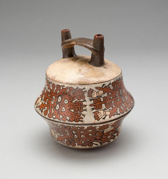 This single-spout vessel depicting an abstracted figure and net pattern was created by the Tiwanaku culture. This vessel emerges from a society whose identity and worldview were deeply intertwined with their environment. The Tiwanaku culture, flourishing in the Andean highlands, saw their art as an extension of their spiritual and social order. The abstracted figure might represent a deity or an ancestor, embodying a connection to the cosmos and the past. The net pattern may symbolize interconnectedness and reciprocity, central values in Andean societies. The vessel form itself suggests communal sharing and ritual practices, reinforcing social bonds. This artwork is more than a decorative object; it is a materialization of Tiwanaku beliefs, reflecting their understanding of the world. It serves as a reminder of the complex and rich cultural expressions of societies outside the Western canon.