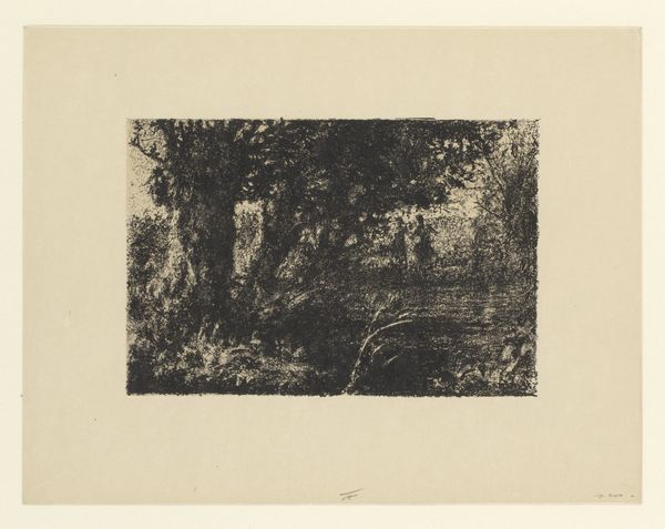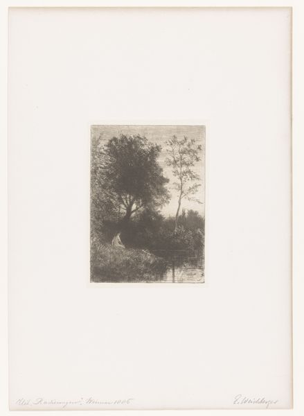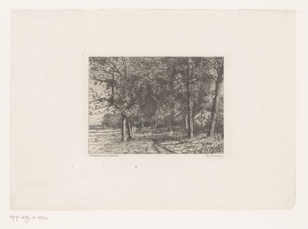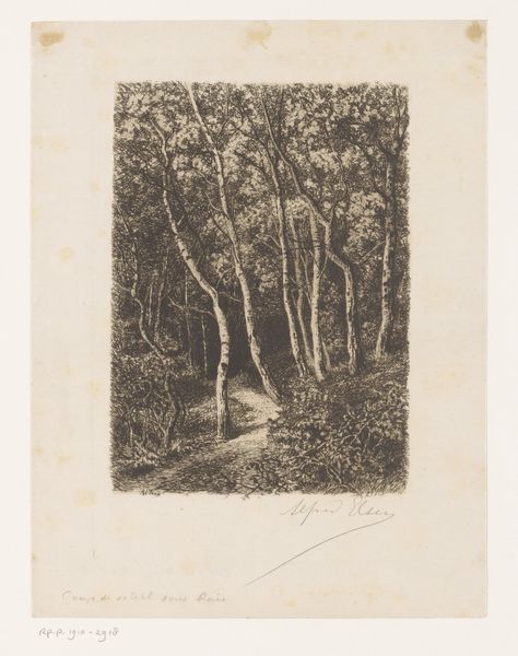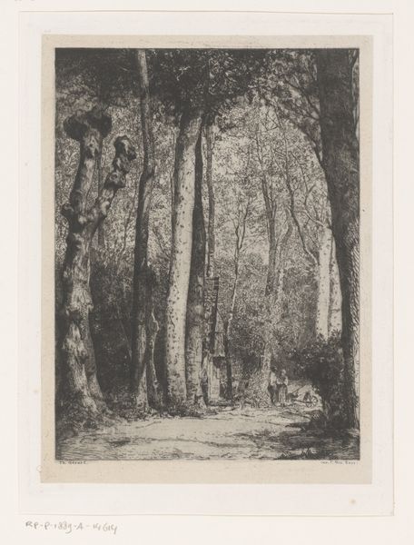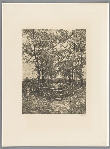 Editor: So, here we have Walter Leistikow's "Boomgroep," an etching from 1896. It feels quite…oppressive, almost? All these tightly packed trees looming over what looks like a narrow path. I'm curious, what do you see in this piece beyond the rather stark scene? Curator: Oppressive... yes, that's a powerful reaction! I feel that intensity, too. But, if you don't mind me musing for a moment, the starkness sings to me. I get lost imagining a walk there – not a jolly walk, perhaps, but one fraught with inner drama! Leistikow, you know, he's playing with this tension between realism and something deeper, almost symbolic. These trees...are they barring our way or sheltering us? Editor: I suppose it could be either. Is that part of the Symbolist element? The ambiguity? Curator: Exactly! Think of the late 19th century – industrialization booming, anxieties rising. Artists were yearning for something beyond mere representation, digging for feeling. Now, look at how Leistikow etches the light. Notice how it falls—or, rather, *doesn't* quite fall—on the path? Where does that pull you? Editor: It does draw my eye there, like a spotlight almost. It's the only real source of light, which makes the woods even darker. I think I understand what you mean about the deeper feeling now, it feels very psychological. Curator: Isn't it fantastic? Almost theatrical, as if waiting for something to happen... What do *you* think will? Or won't. Editor: This has totally changed how I see it. At first, it just looked like a gloomy forest! Now I get the… the story. Curator: Exactly. And there you have it – an oppressive landscape suddenly whispering secrets! That’s what makes art such a delicious journey of perception!