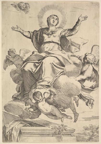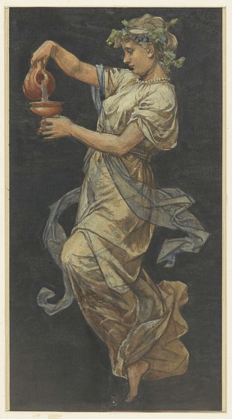 Curator: Ah, welcome. Before us, we have "Harvest Home, Italy," a print from the Holidays series (N80) designed for Duke brand cigarettes, dating back to 1890. It resides here at the Metropolitan Museum of Art. Editor: What a vibrant image, especially considering it’s essentially an advertisement. I’m immediately drawn to the texture of the paper itself – seems like it has a definite weight and tooth to it. Curator: The composition adheres to classic portraiture principles, wouldn’t you agree? The figure is centered, her gaze direct, establishing a clear visual hierarchy. Note the delicate watercolour, heightened by the coloured pencil details, lending depth and sophistication. Editor: I’m thinking about the economics here. This card would have been mass-produced, yes? So the artisanal quality implied by the watercolour is almost ironic; the material value as distributed versus inherent worth… Curator: Intriguing! And yet, consider the careful arrangement of colours: the interplay between the earthy tones of the harvest backdrop and the woman's vibrant clothing. Semiotically, the tambourine signifies celebration and abundance, reinforcing the idea of "Harvest Home." The patterned cloth also strikes a certain compositional note, as if suggesting a cultural geometry, an imposed harmony on a rural scene. Editor: It makes you wonder about the conditions of the garment production. The woman in the image projects idyllic celebration; did that same joy imbue the unseen labour that materialized this small card? Was the work that went into printing and packaging these advertisements a part of the romantic picture it tried to create? Curator: The choice of subject is purposeful. W. Duke, Sons & Co. were not only selling cigarettes; they sold a romanticized view of global culture, of tradition celebrated. Editor: Indeed. And they relied on the ready availability of the images themselves, not only for sales, but to validate the idea that commodities and the consumer lifestyle can make something like this a cultural norm. Curator: Precisely. It's an aesthetically refined piece operating within a complex socio-economic framework. Editor: And those tensions, the way image meets labor and the commodified desire to buy, makes the picture a compelling artifact today.