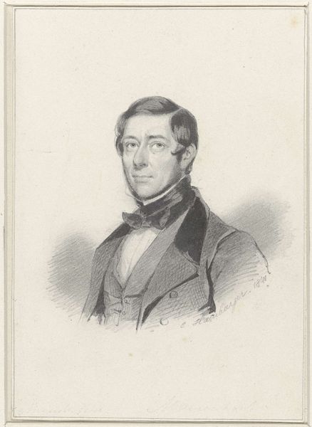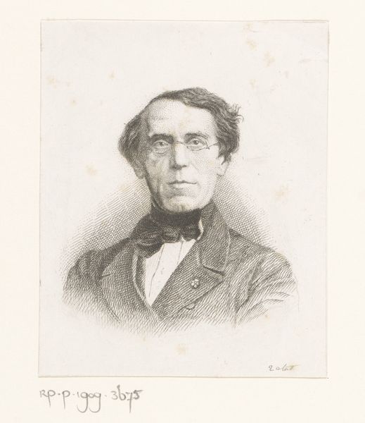 Editor: We’re looking at a print, “Portret van Timon Henricus der Kinderen,” dating from 1842 to 1887. It's an engraving on paper of Adriaan Uyttenhooven. The detail is quite striking. What are your first impressions, and what should viewers pay attention to in this portrait? Curator: I find the interplay of light and shadow most compelling. Observe how the artist uses delicate lines to model the subject's face, creating a sense of depth and volume despite the monochrome palette. The textures are also particularly noteworthy, especially in the rendering of the fabrics. What do you notice about the composition? Editor: It seems very classical in its symmetry, and how the figure occupies the frame. It's focused on the upper body, cut off at the torso; his face is framed by his dark hair and clothing. The background fades almost into nothing. What can you tell from these aspects? Curator: Precisely. The artist employs a pyramidical structure, with the head at the apex, lending the portrait stability and dignity. The stark contrast between the subject and background serves to isolate and emphasize his presence. The focus on formal elements suggests that we’re meant to appreciate the artistic skill evident in its creation. Do you perceive any symbolic meaning within these choices? Editor: I hadn’t thought of it that way. It seems I was focused too much on *who* was depicted rather than *how* he was depicted. Curator: That’s a common, and understandable, error. By deconstructing the image through its formal qualities, we begin to grasp the artist's intent and the deeper significance embedded in the work. I have a greater appreciation of engravings by concentrating on elements that aren't necessarily apparent from viewing alone. Editor: I feel more informed about the period's focus on capturing not just likeness, but form and technique as well, thanks to this deeper reading.