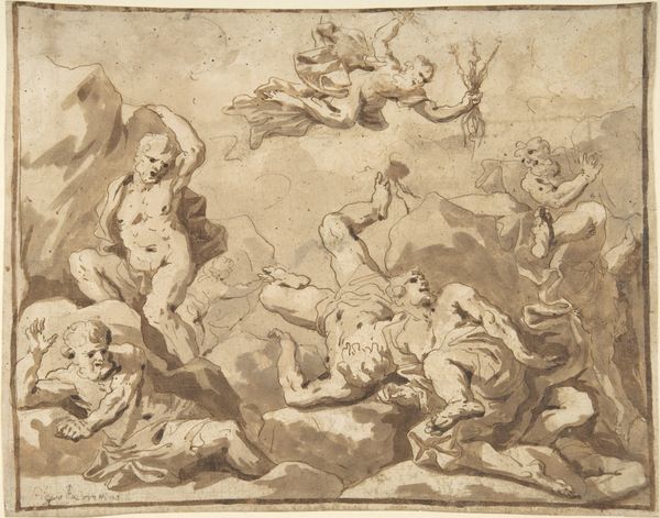 François Verdier created this drawing, "The Rape of Deianira," using pen and brown ink with wash on paper. The eye is immediately drawn to the dynamic central grouping: the centaur Nessus abducting Deianira. This is rendered with curvilinear forms against the stark landscape. Verdier organizes the composition around a play of diagonals. The tension is palpable. Notice how the artist uses line and shadow to define the figures' musculature, heightening the drama of the abduction. The drawing gains its complexity through the arrangement of the figures and their interaction. Verdier uses the figures to destabilize conventional values. The centaur, traditionally a symbol of untamed nature, here embodies aggression. The contrast between the figures' emotional states further amplifies the narrative. The formal qualities of the drawing invite viewers to consider how power, desire, and conflict are represented through visual language. The work is not just an aesthetic object but a site of cultural and philosophical discourse.