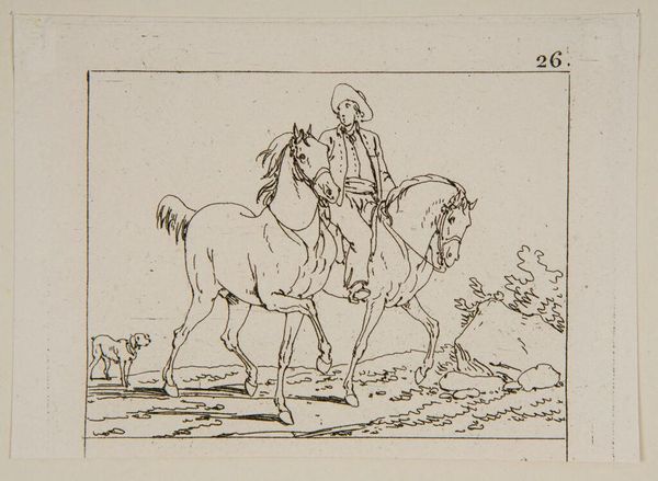 Curator: Here we have Jacques-Francois-Joseph Swebach's "Plate XIV," a line drawing from the Harvard Art Museums. It presents a scene with two men, one mounted on a horse. Editor: It strikes me as a rather confrontational composition. The line work, though simple, creates a sense of tension; the figure on foot is emphatically pointing, which gives a directional, instructional mood. Curator: Precisely, and Swebach's use of line speaks to the economics of printmaking. The accessibility of this medium enables the wide dissemination of his narratives and imagery, potentially influencing social and political discourse. Editor: I agree. This image may be hinting at power dynamics, instruction, or perhaps resistance. The man on horseback is, perhaps, representative of social order. Curator: A compelling interpretation. The materials themselves—the paper, the ink, the printing process—reflect the broader cultural context. Editor: Right. Images like this really get us thinking about the role of art in portraying social relationships. It's a reminder of art's function to influence and mirror the power struggles of its time.